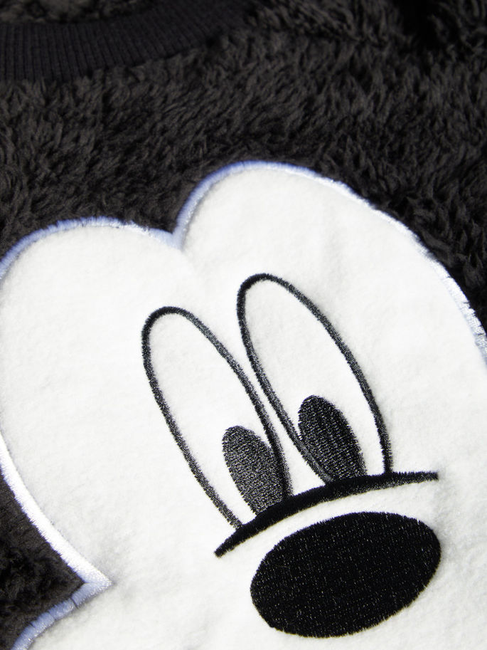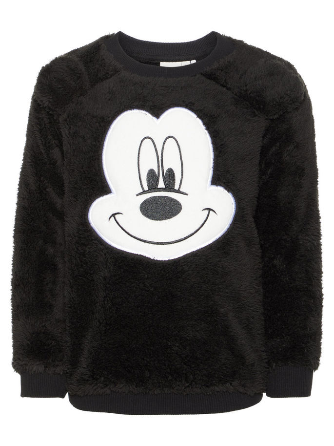 Name It fleecegenser til barn. Svart genser med applikert Mikke Mus på magen. Herlig genser i myk teddy. Den har rund hals og lange armer.