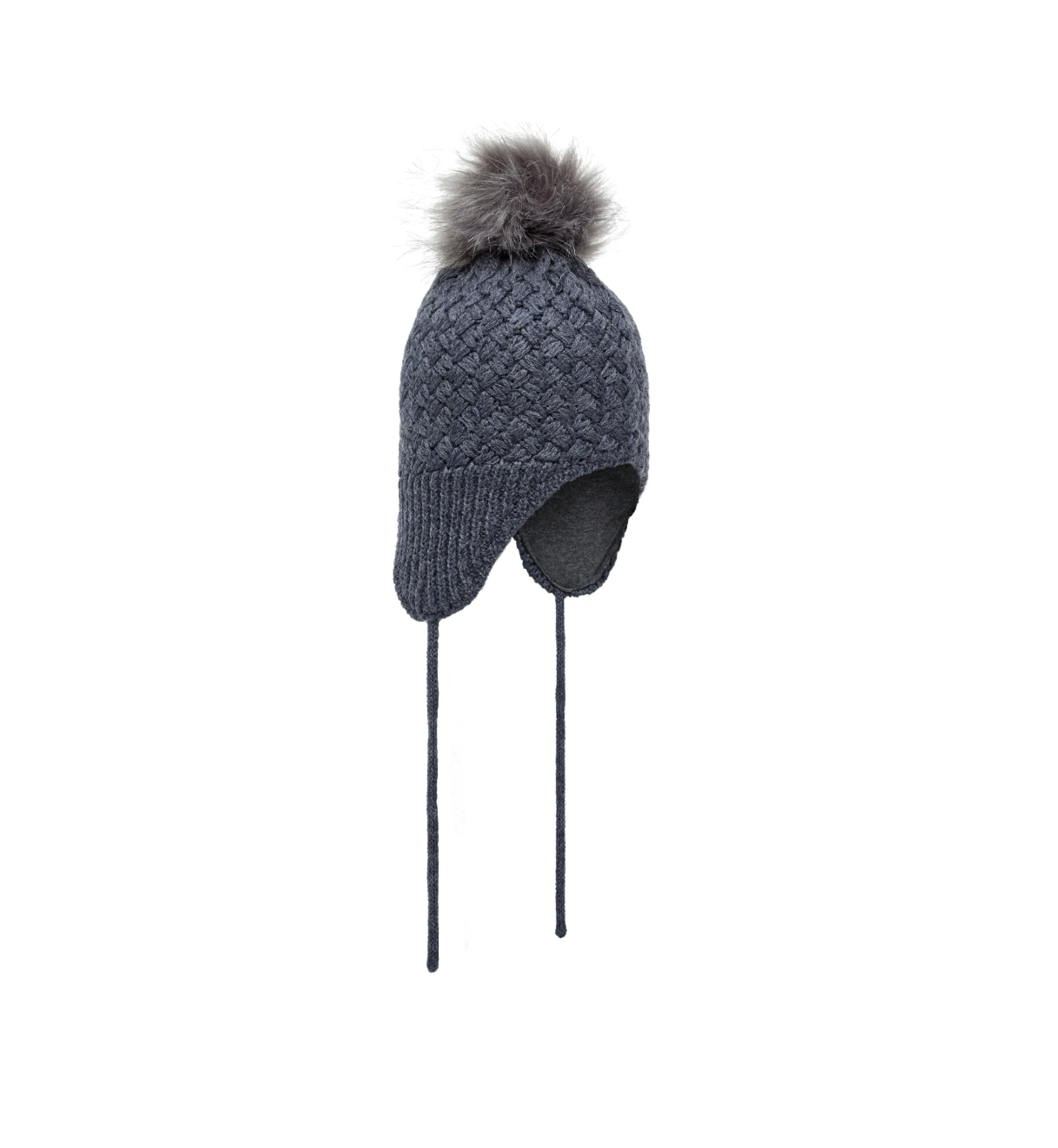 Blå strikket ullue – Dusk i faux fur på toppen – Knytesnorer
