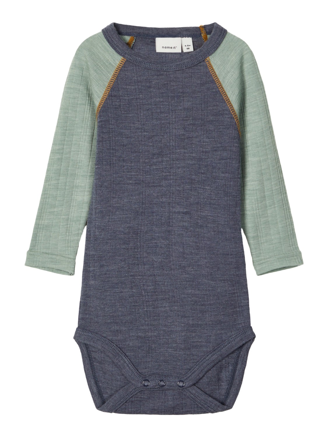 Blå og grønn ullbody til baby. Bodyen er i ribbestrikket struktur og har oransje sømmer.