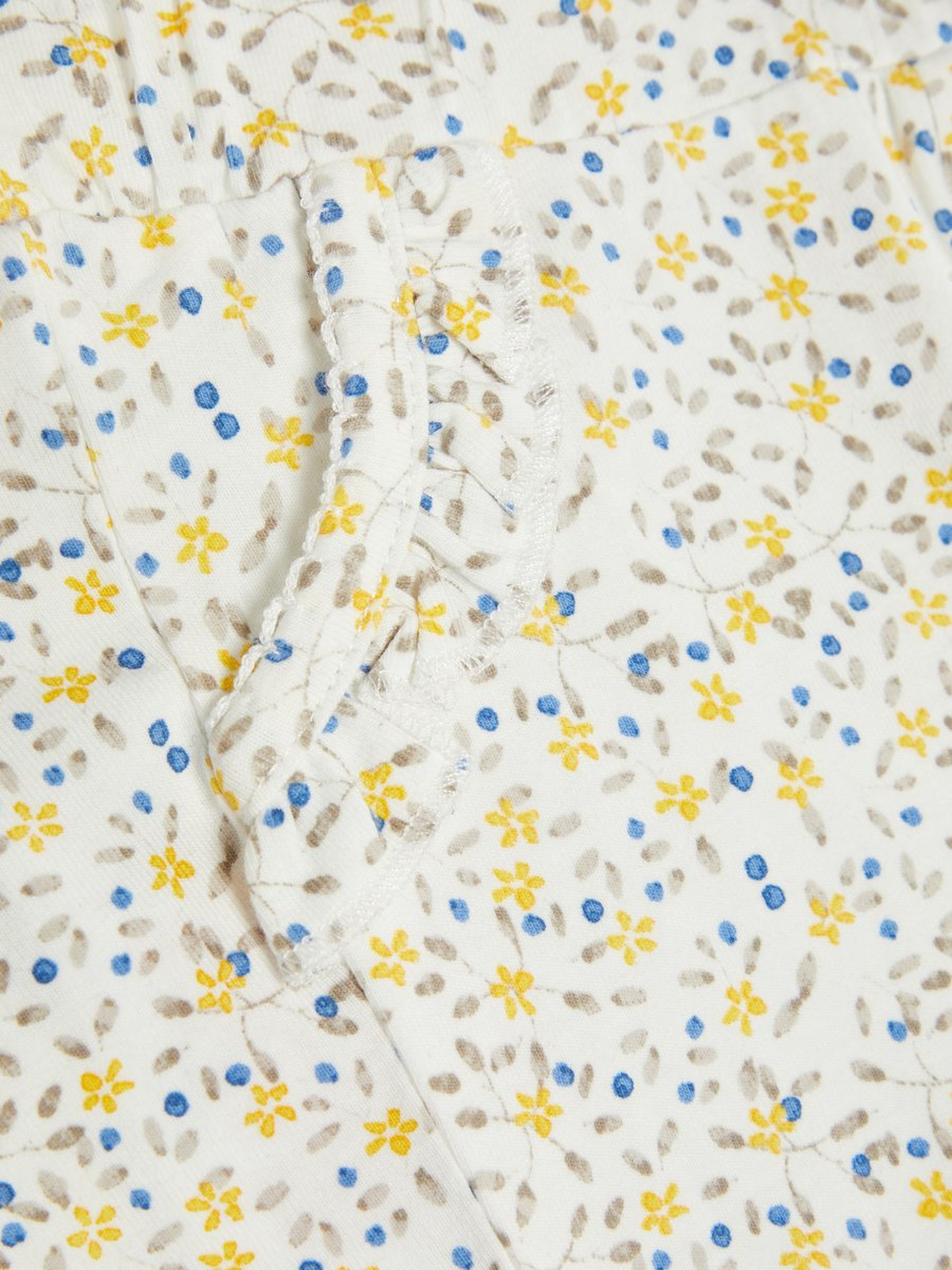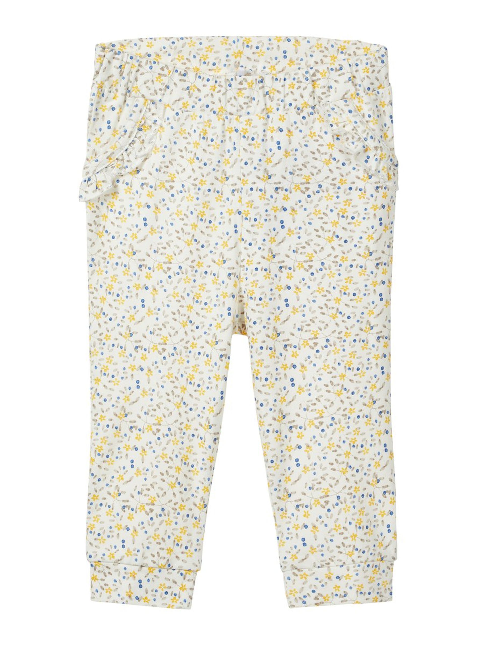 Name It bukse blomster. Off white myk bukse til baby. Buksen har stikk i livet og søte volanger ved lommene. Buksen har små blomster i gult, grønt og blått. Feminin og søt bukse til jente. Vi har body i samme serie som passer til.