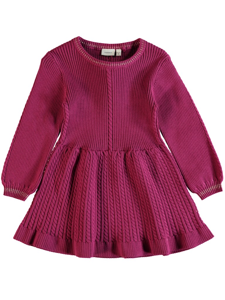 Rosa kjole til barn fra Name It. Søt strikkekjole i bomull og i flott cerise farge. Kjolen har rund hals og lange armer, den er ribbestrikket med kabelstrikket skjørt. Kjolen har god vidde i skjørtet – utrolig fin! 100% bomull.