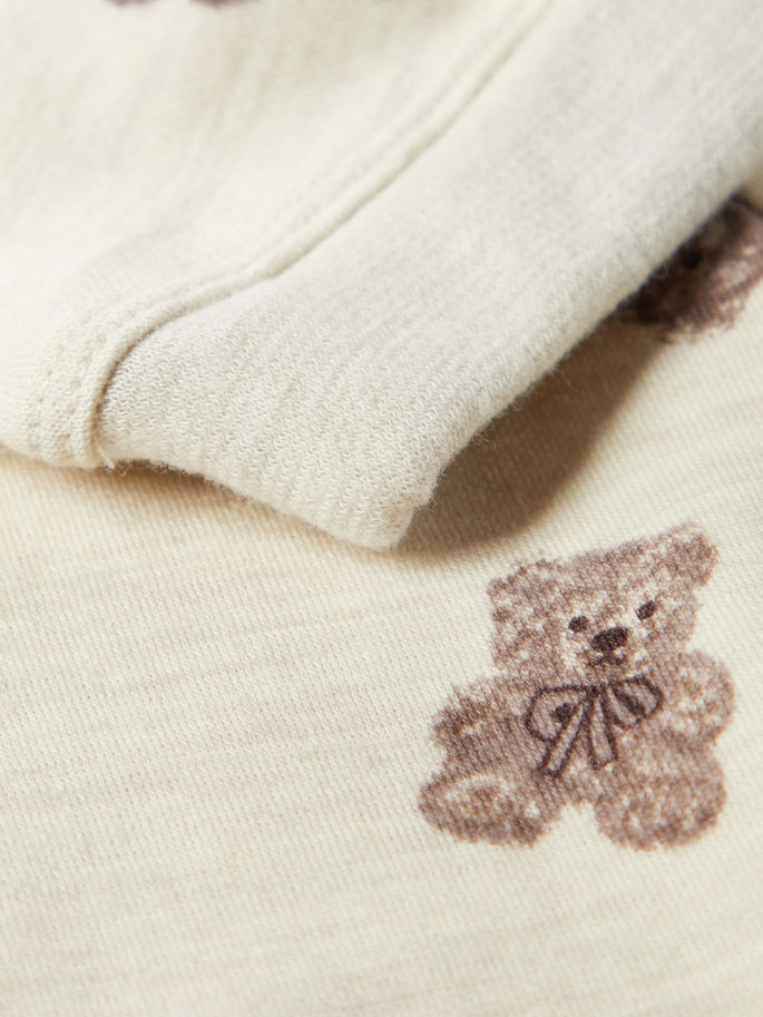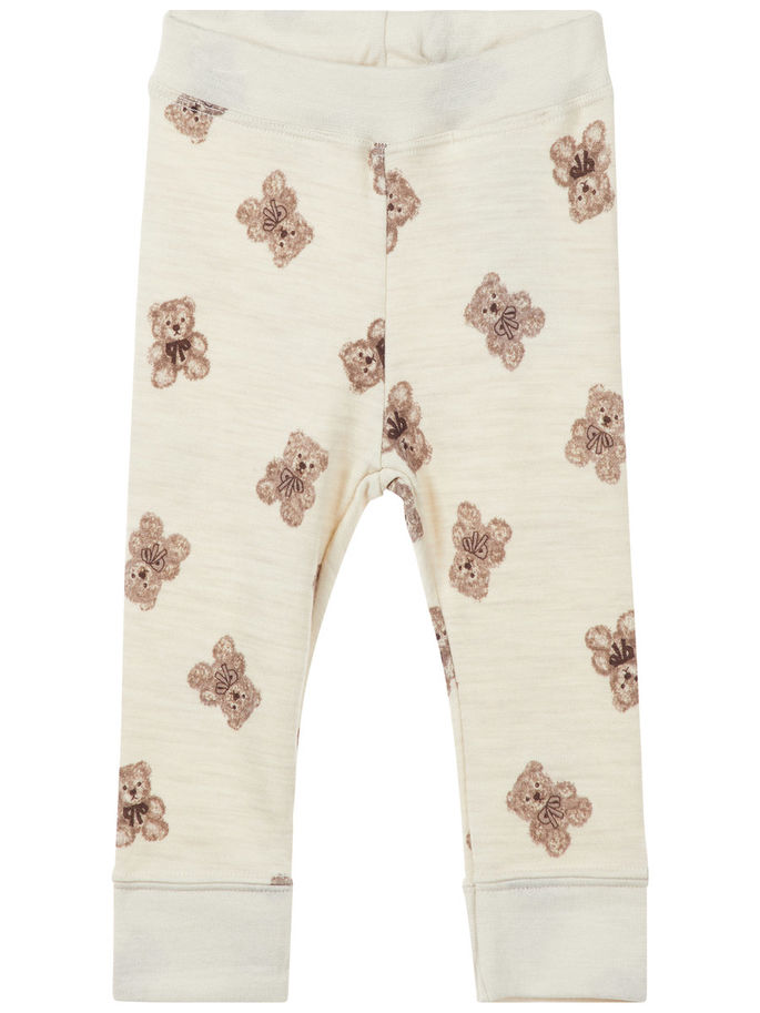 Ull-longs til baby fra Name It. Søt beige ullbukse med printa av brune bamser. Longsen er dobbelt-vevd, ull utenpå og bomull på innsiden.