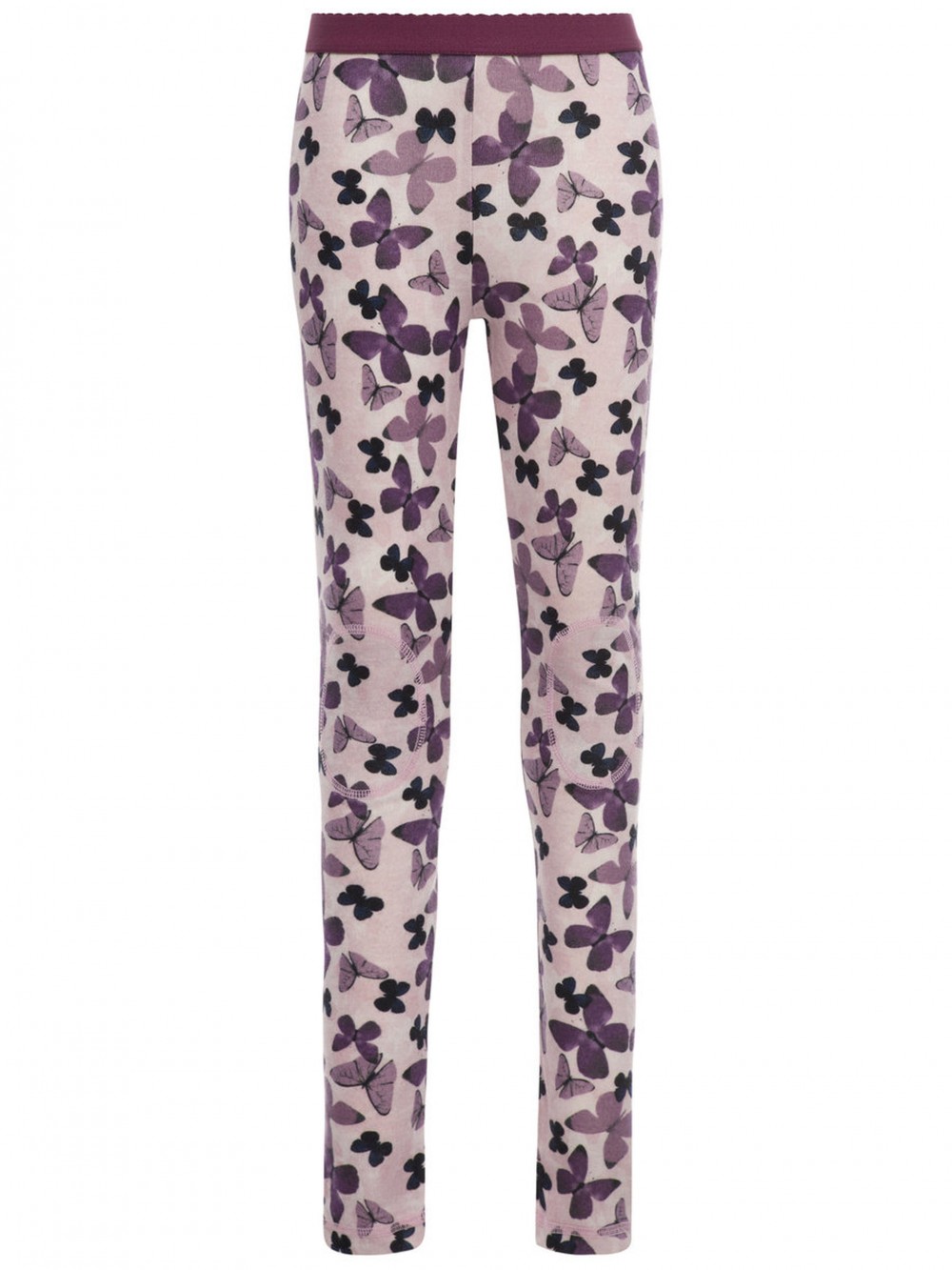 Name It ull-longs til barn. Lilla ull-leggings med bred elastisk linning og sommerfugl-print, 100% merinoull. Longsen har forsterkninger på knæren og er myk og behagelig. Vi har trøye i samme serie.