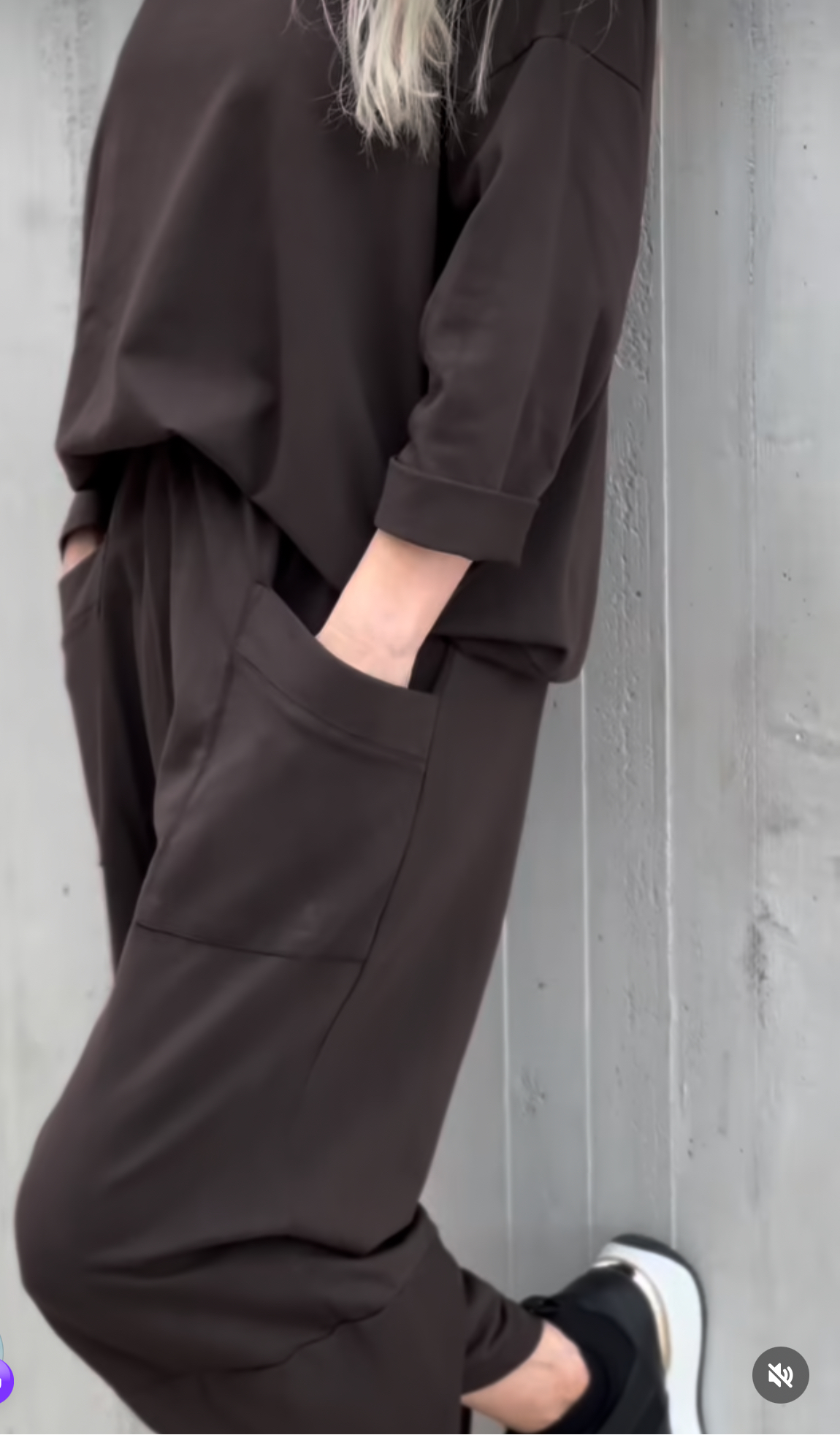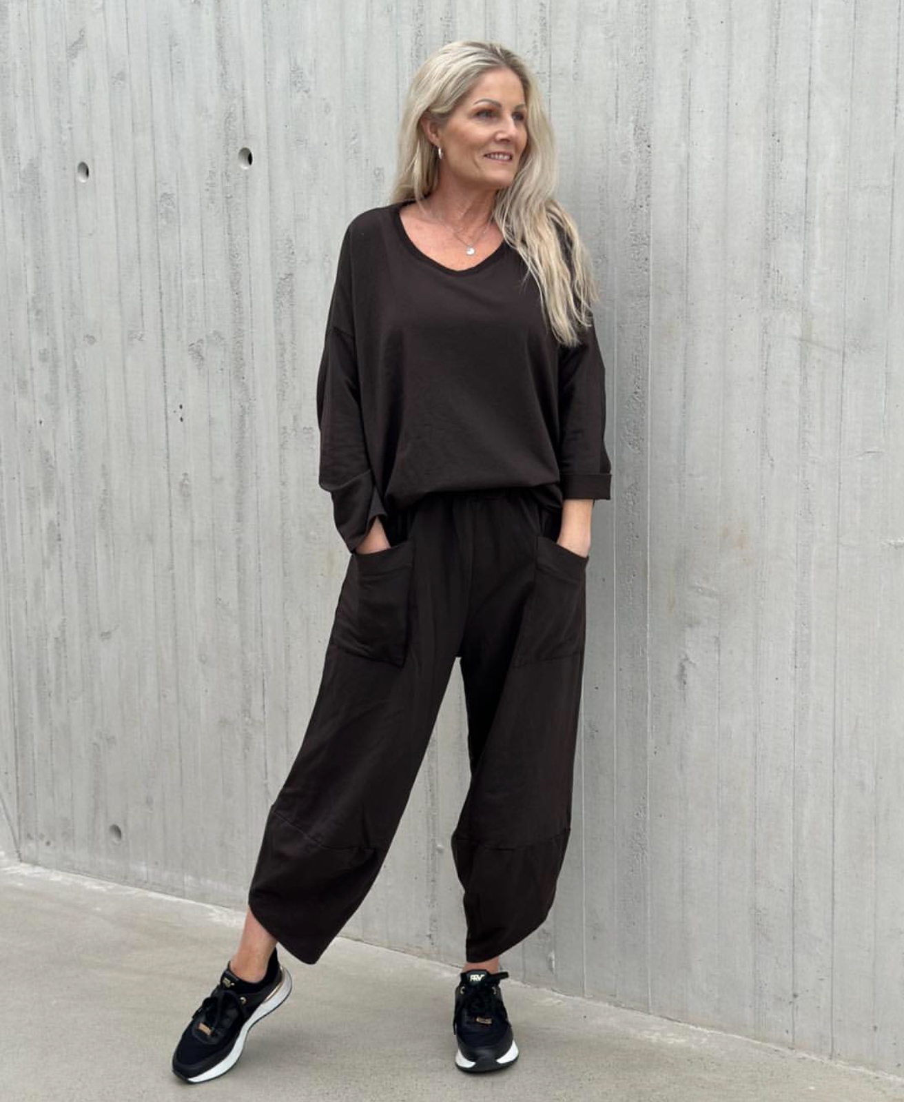 Myk og herlig bukse med strikk i livet, store lommer og 7/8-dels lengde.