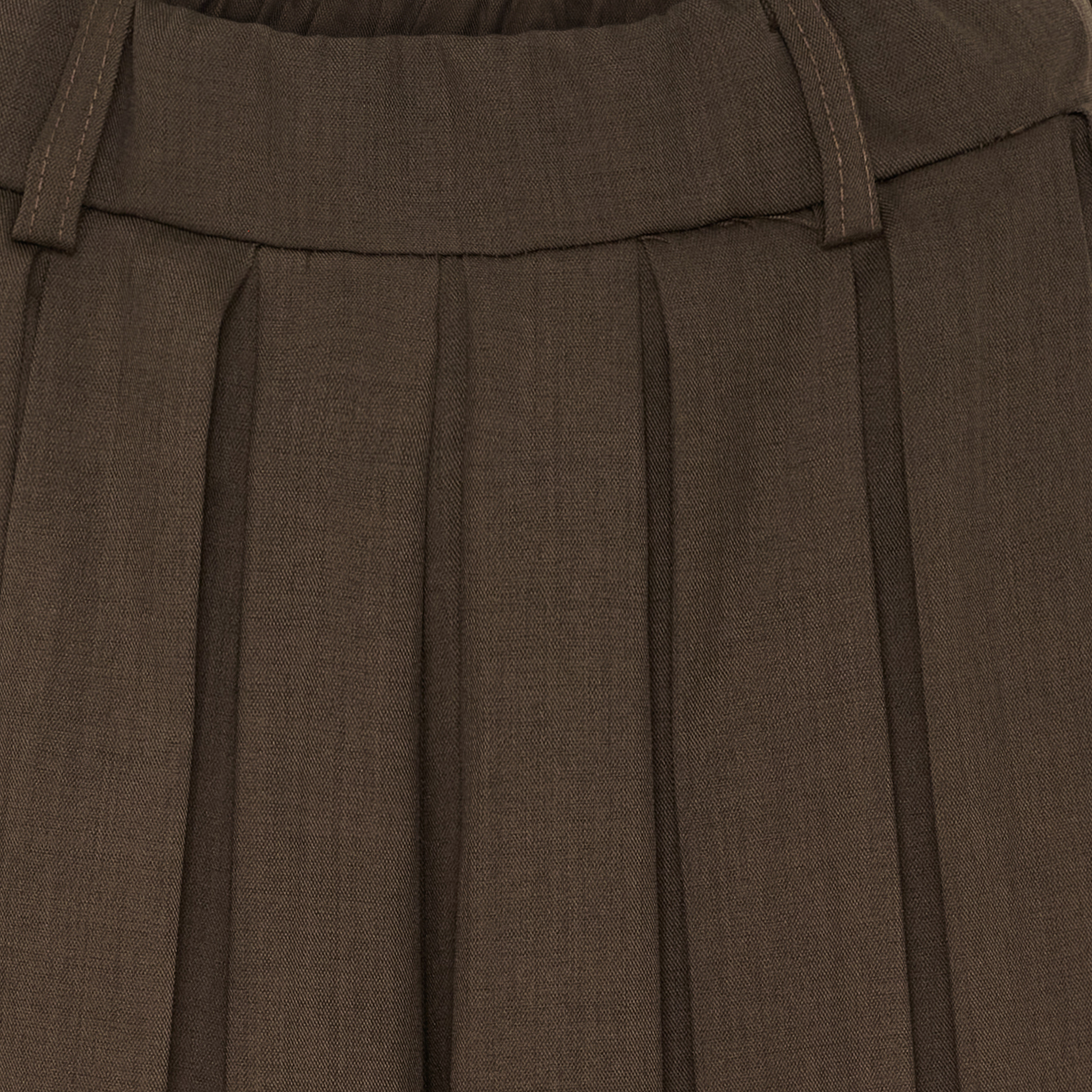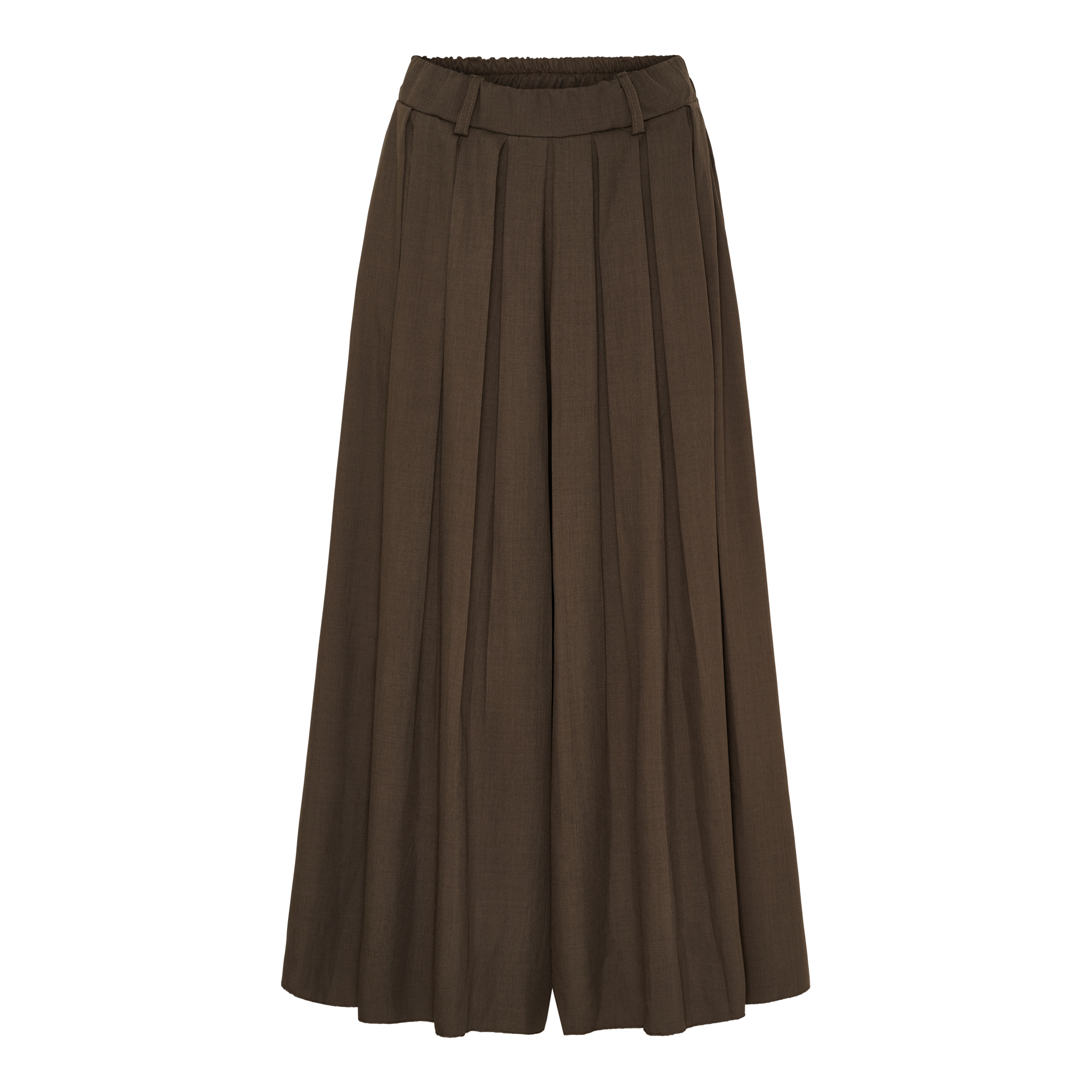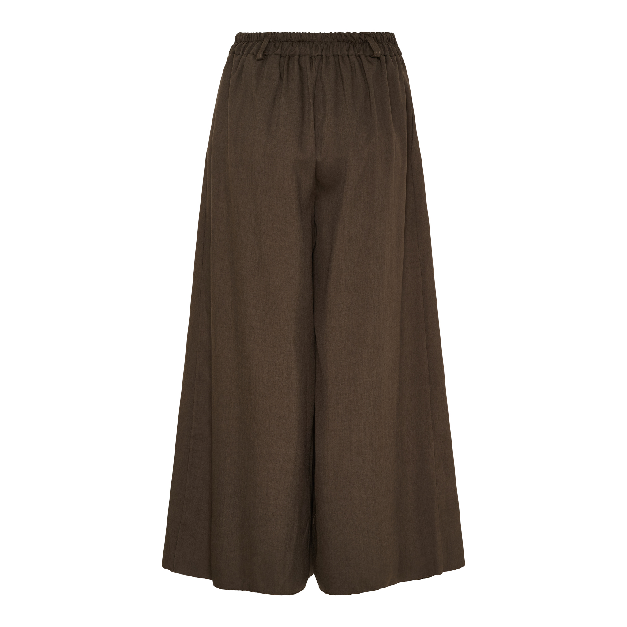 Brunt bukseskjørt, strikk i livet og lommer i siden. One size, strikk i livet samt beltehemper.