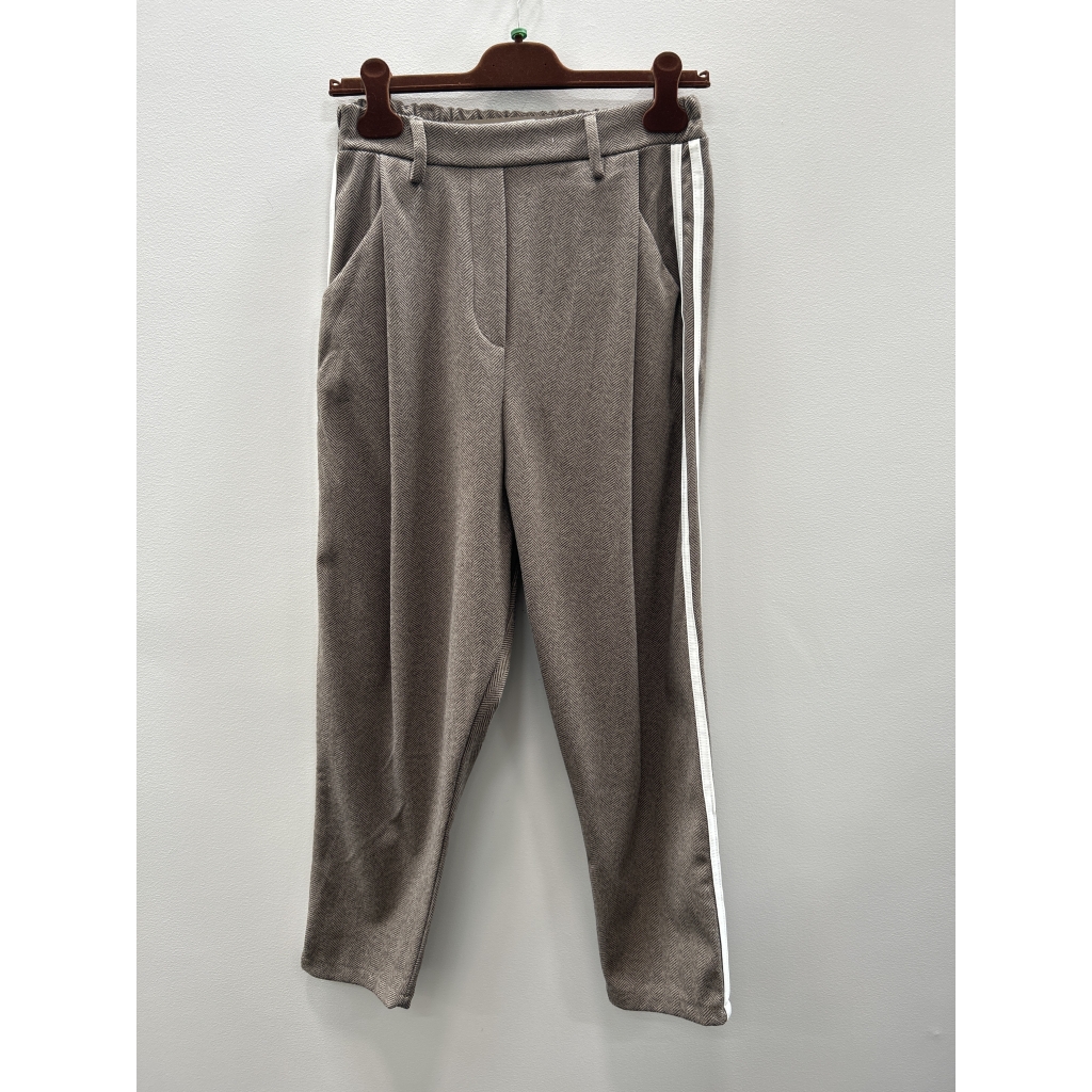 Brun, lun og myk bukse med fiskebeinsmønster. Strikk i midjen bak og lommer i siden.
