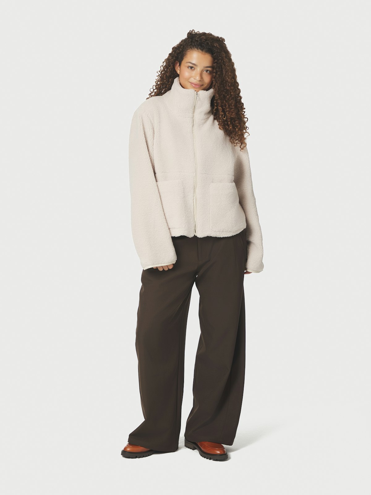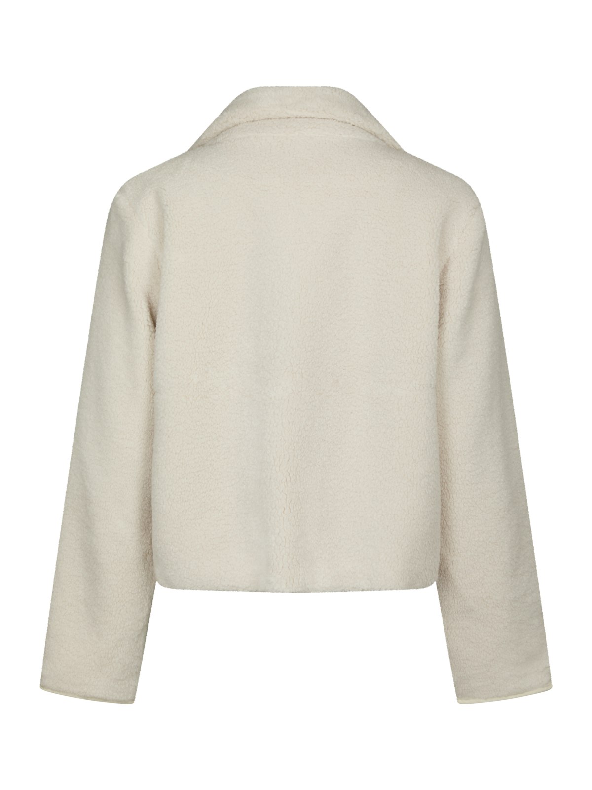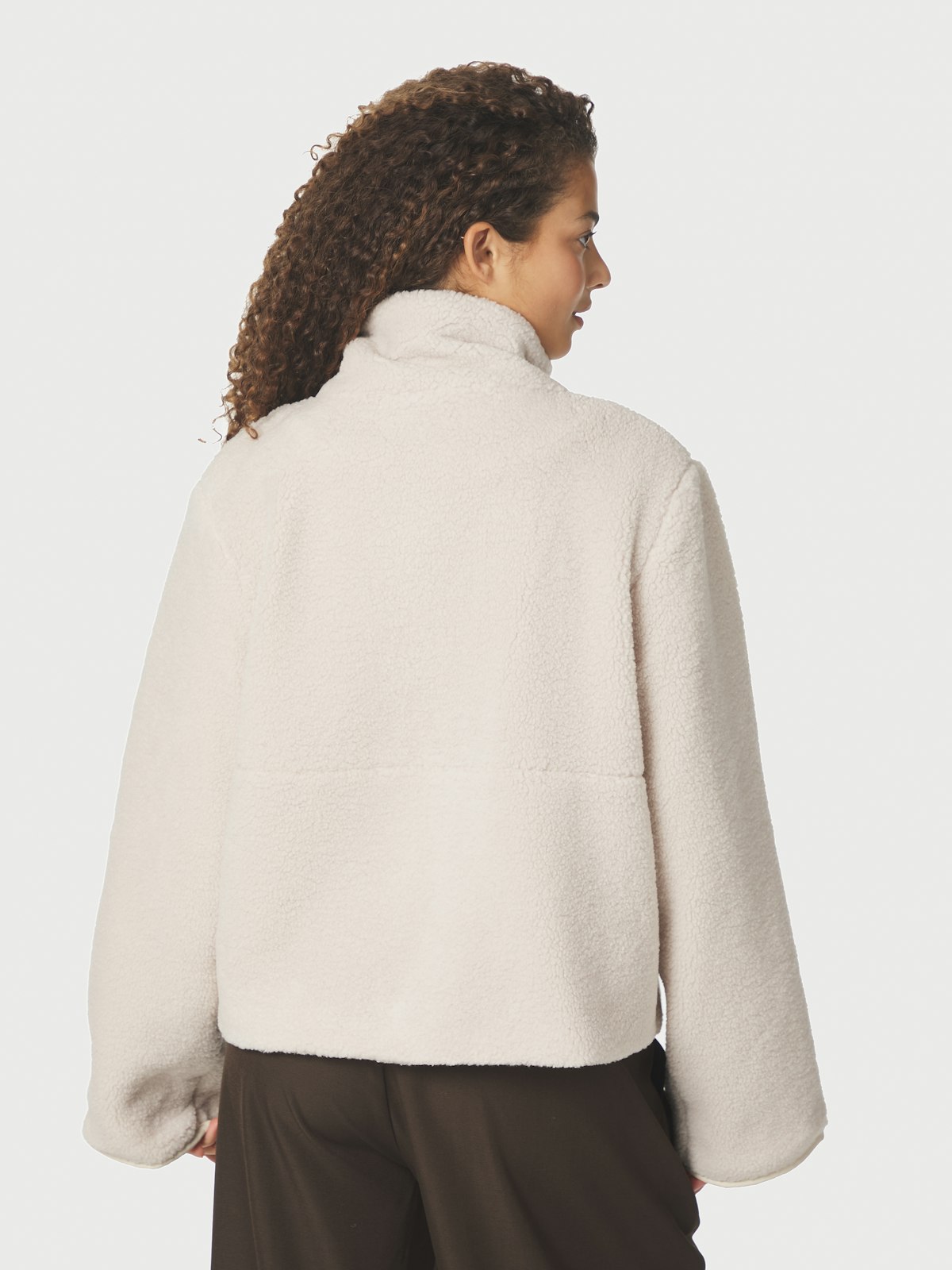 Jakke i teddy/fleece – glidelås med høy krage, lommer.