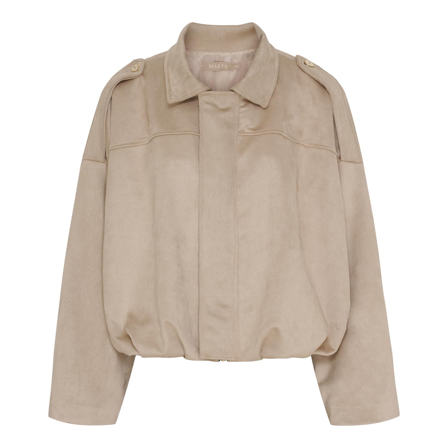 Beige tøff bomberjakke i herlig og myk «semsket» kvalitet. Oversizet passform. Fin å bruke inne i vinter eller som overgangsjakke på våren. 95% Polyester, 5% Elastan