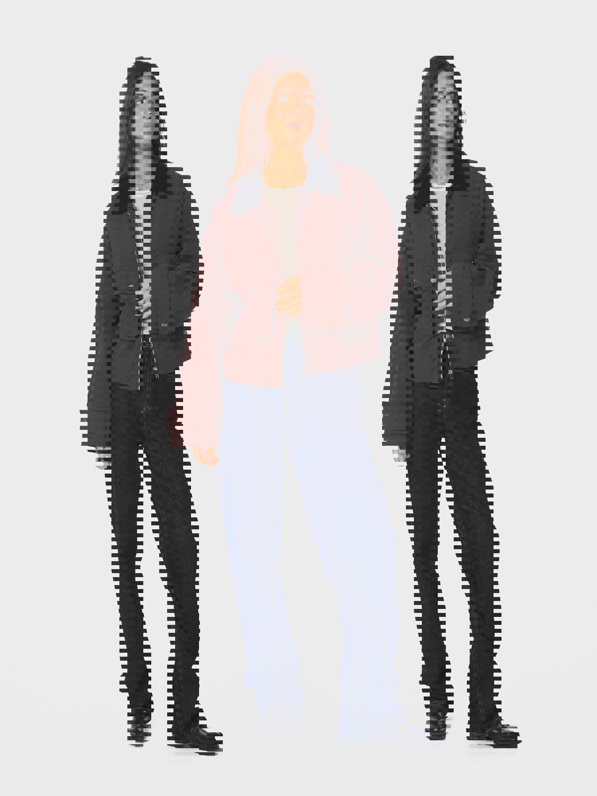 Superkul jakke med senkede skuldre og krage i kontrastfarge. Kvaliteten er et fint vasket lerret med lukking foran. Modellen er 176 cm høy og bruker størrelse 36.