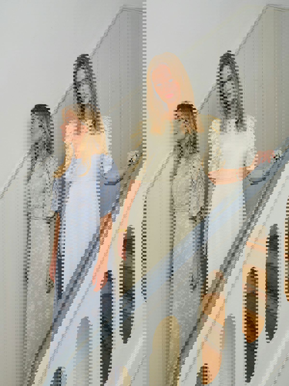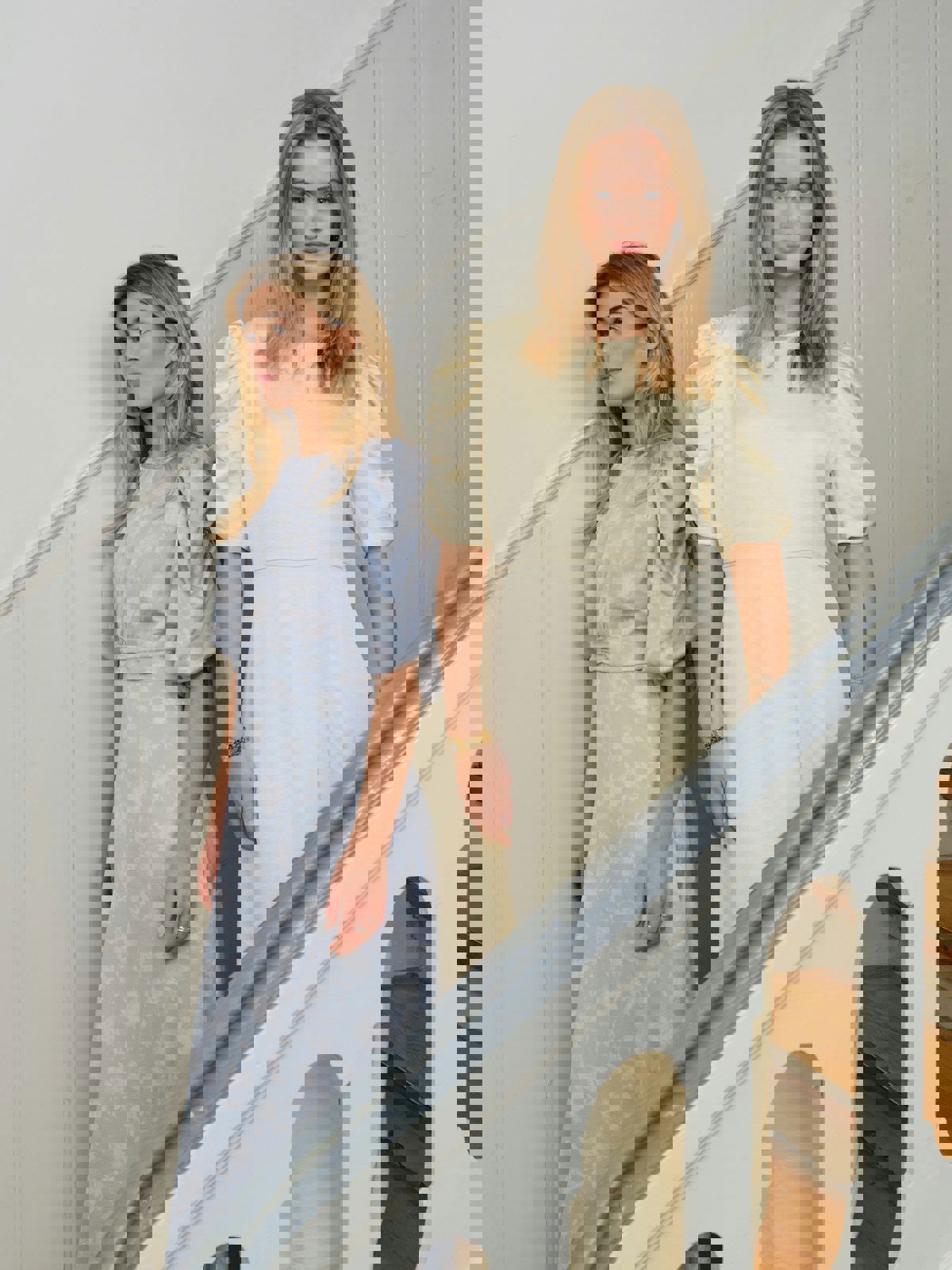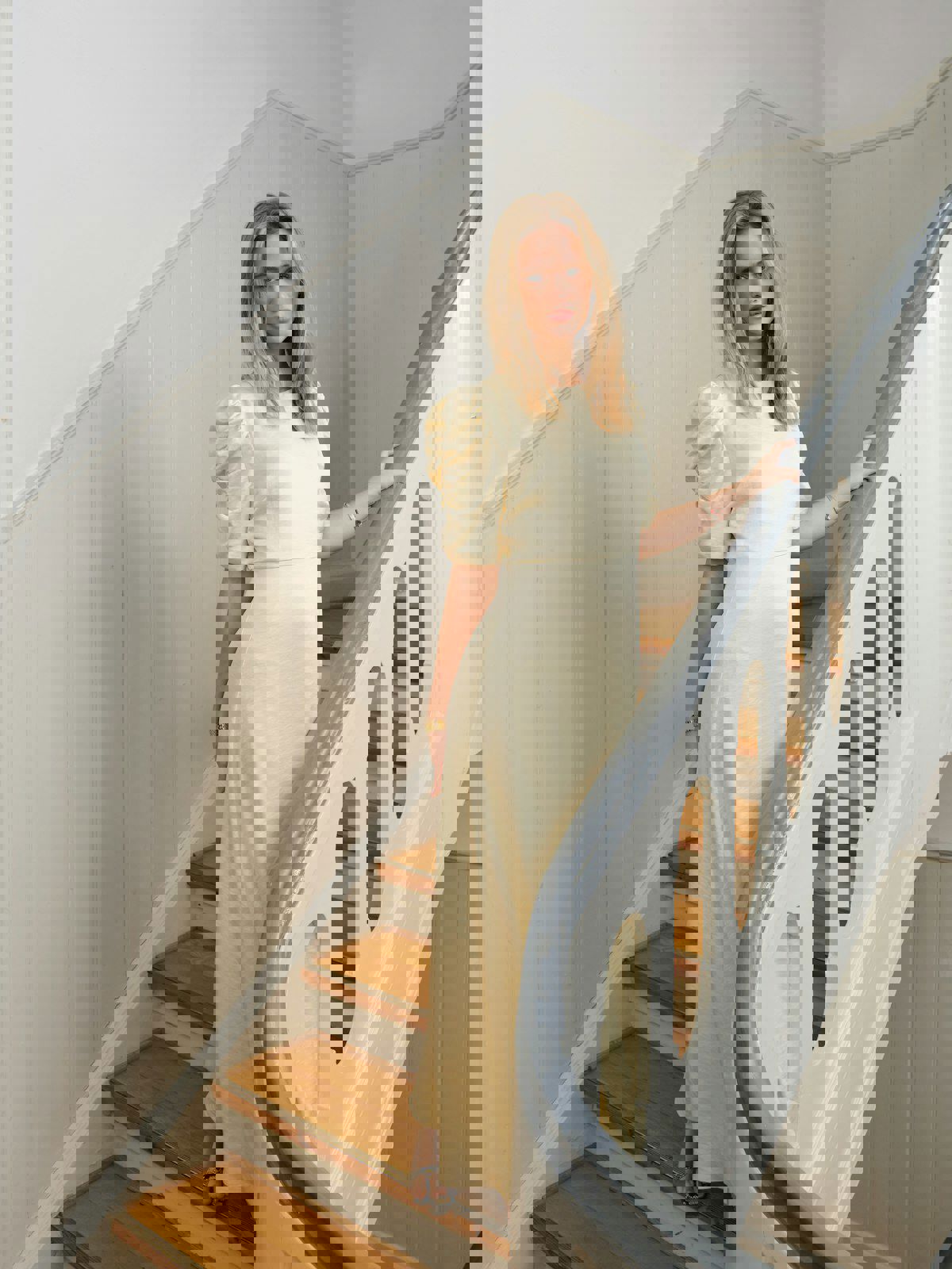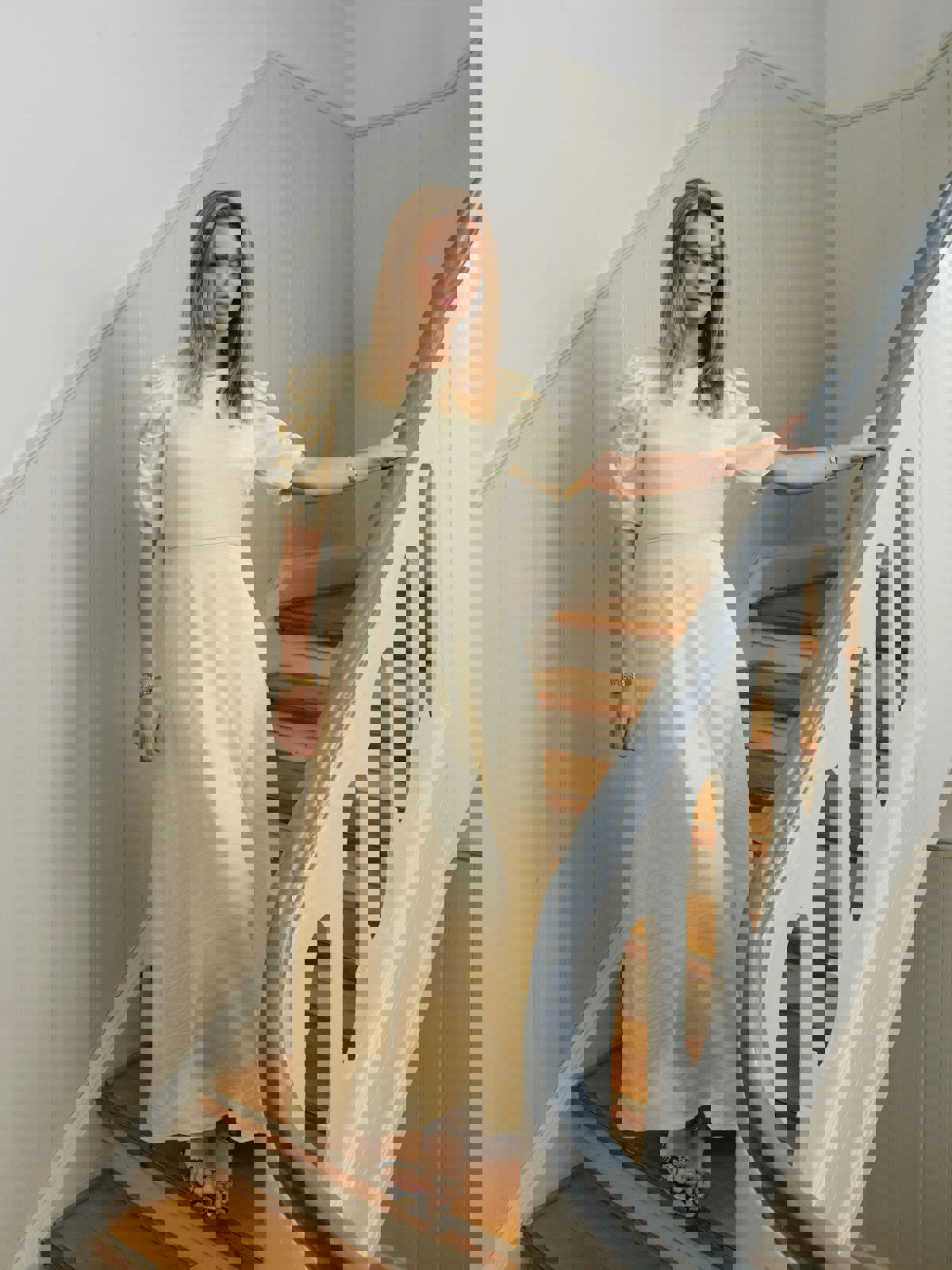 Elegant og feminin lang kjole. Kjolen har korte ermer med rynkeeffekt og glidelås bak i nakken. Modellen er 176 cm høy og bruker størrelse 36.
