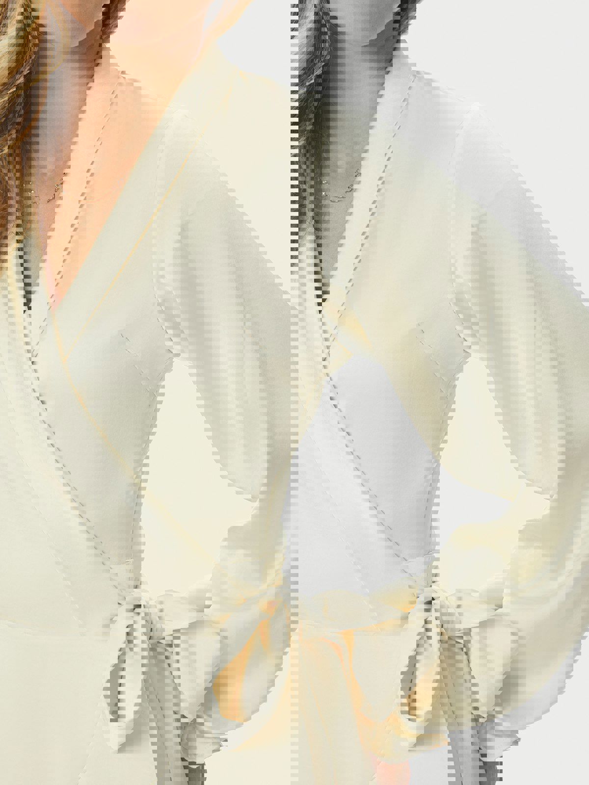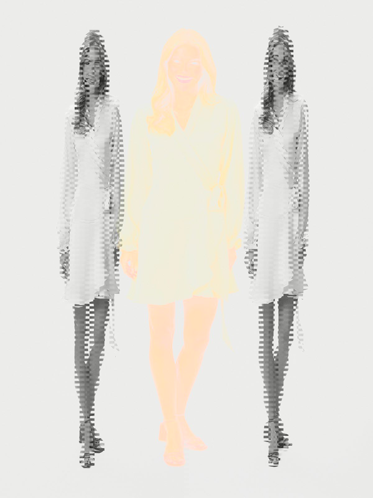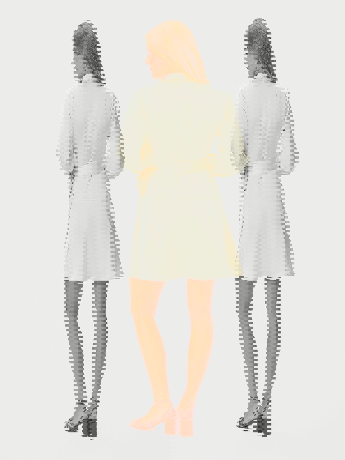 Søt kort kjole med lange ermer, i en fin tung sateen kvalitet. Modellen er 176 cm høy og bruker størrelse 36.