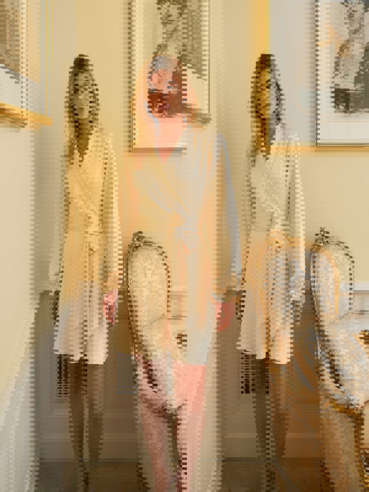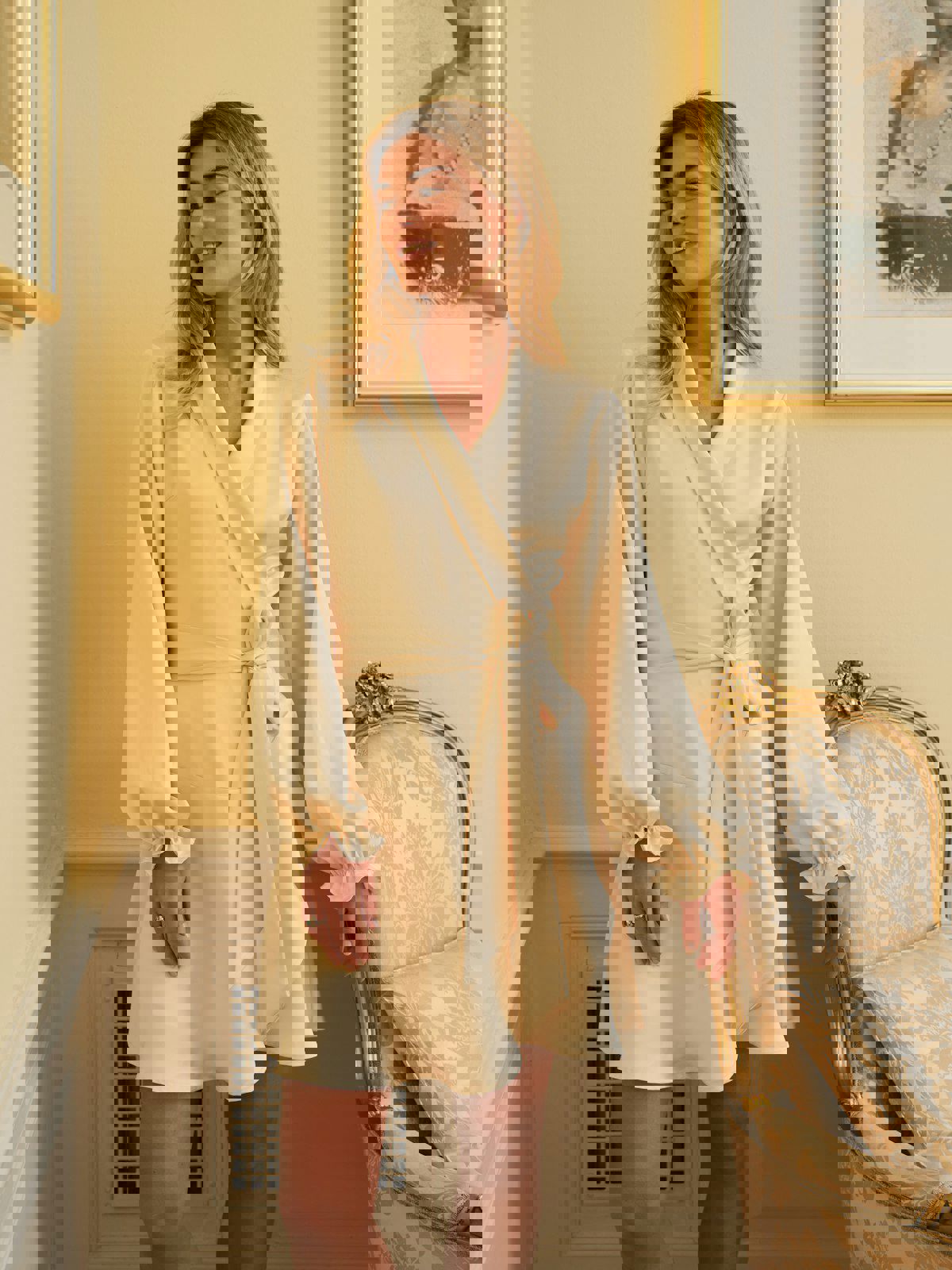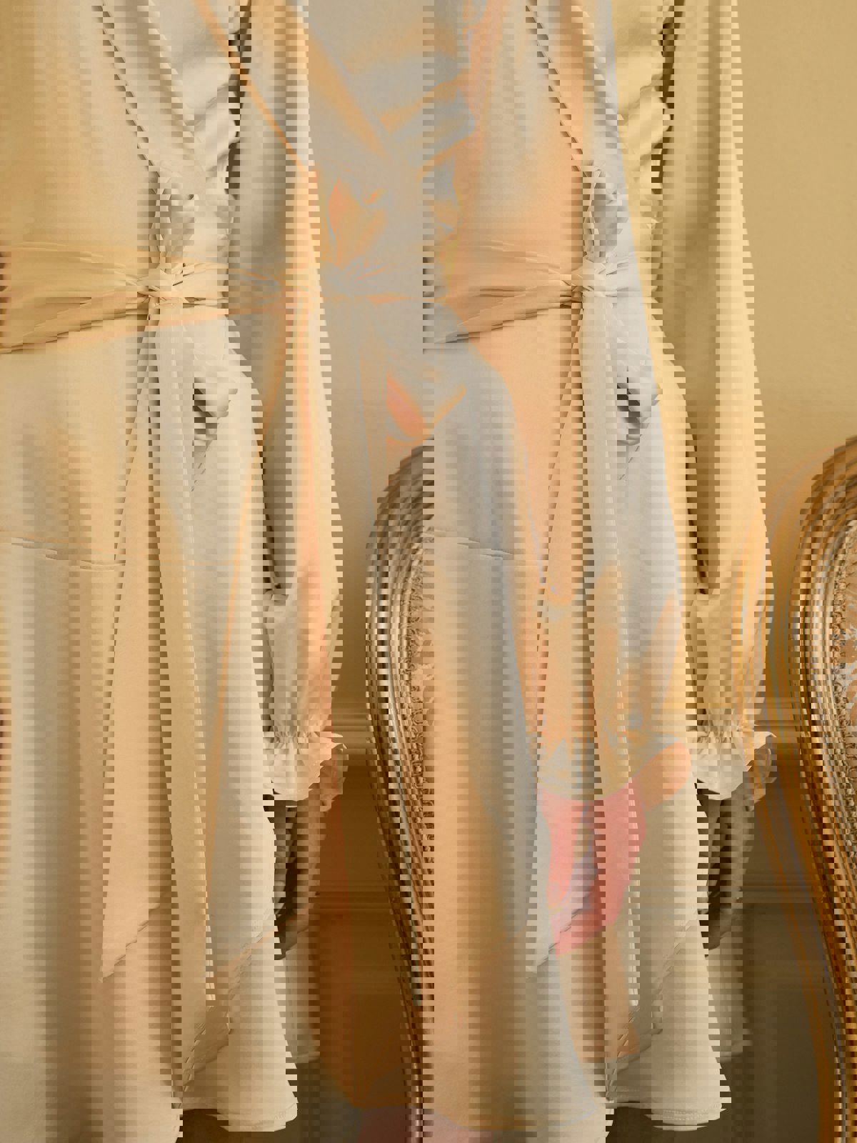 Søt kort kjole med lange ermer, i en fin tung sateen kvalitet. Modellen er 176 cm høy og bruker størrelse 36.