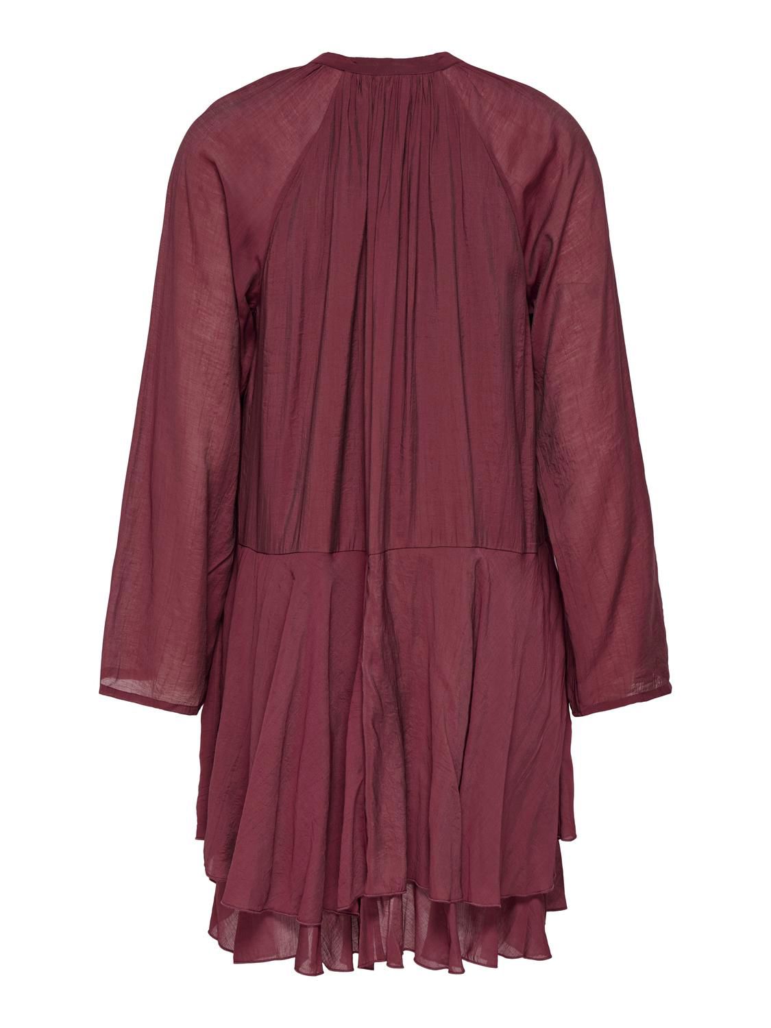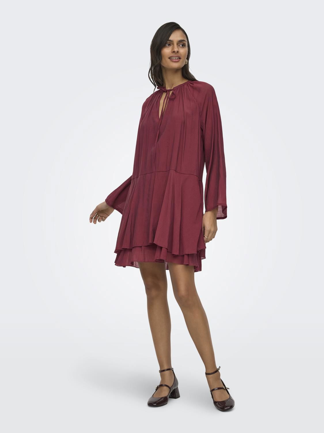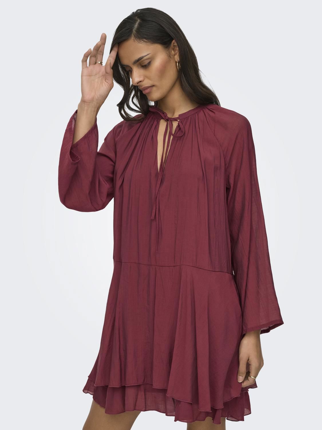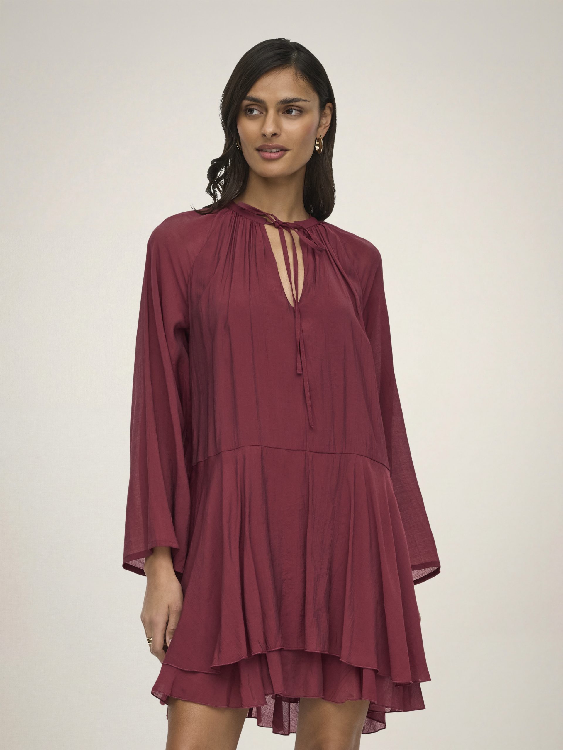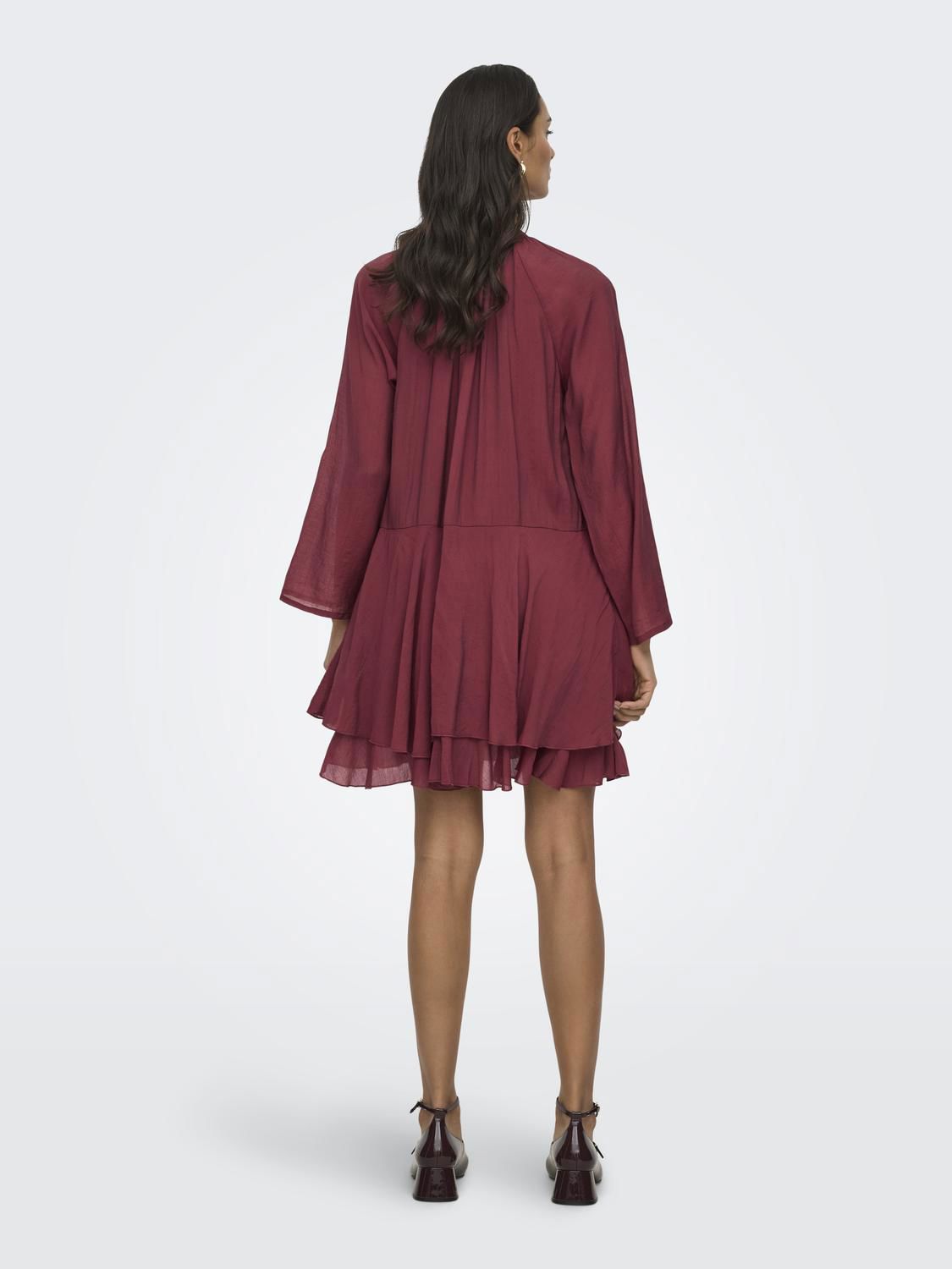 Løs og ledig kjole med volanger som gir et feminint uttrykk.