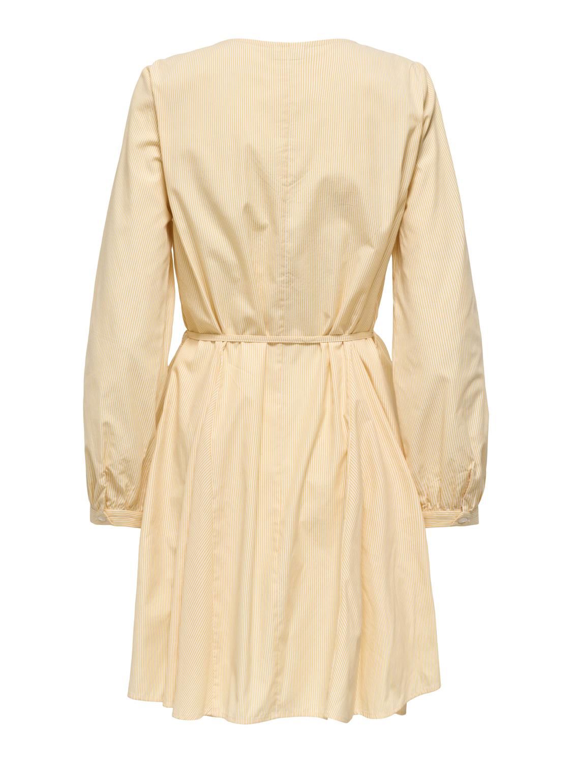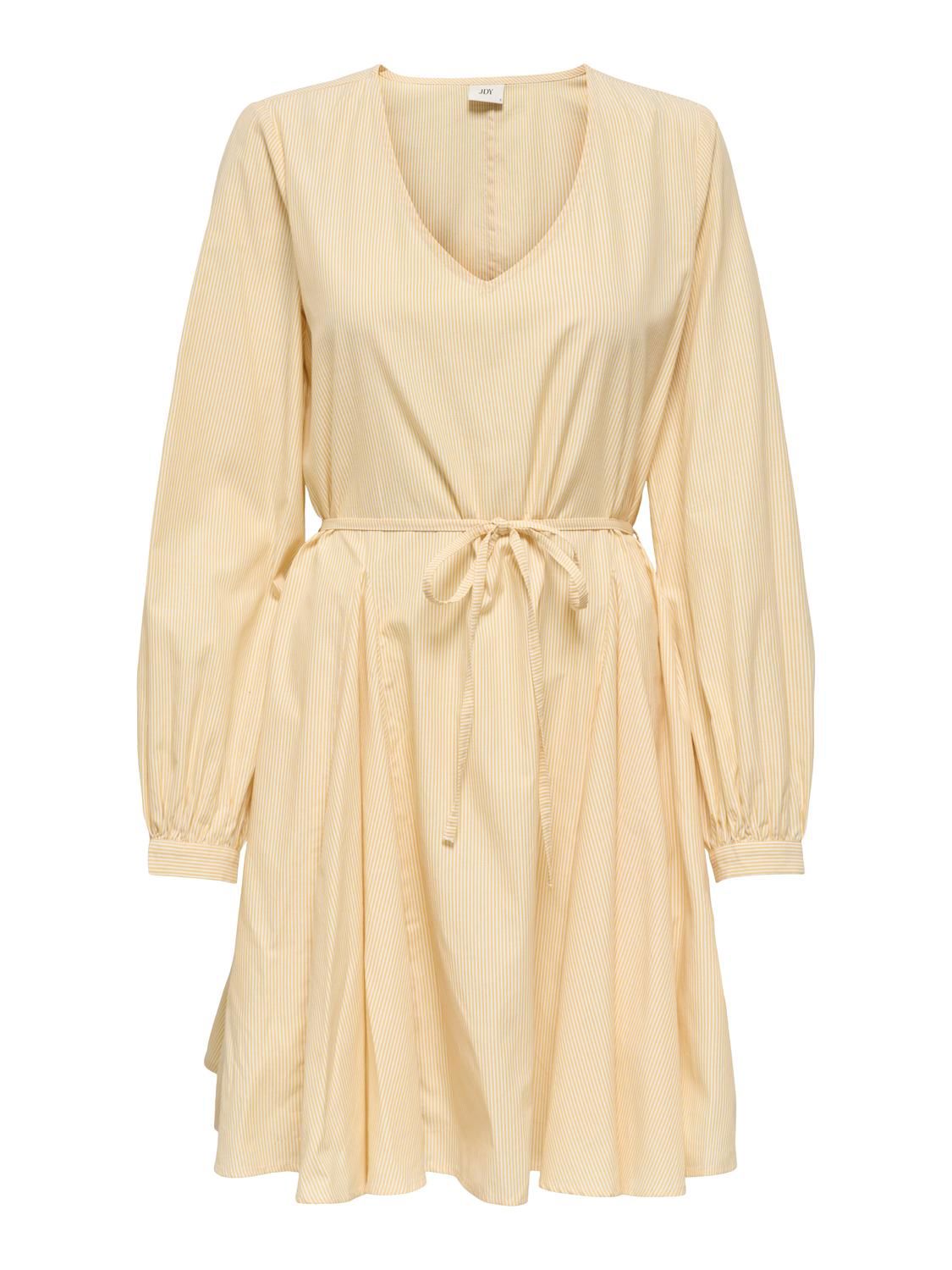 Kjole med v-hals og lange ermer. Knytebelte i midjen.