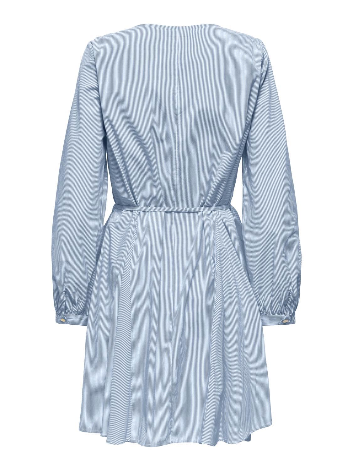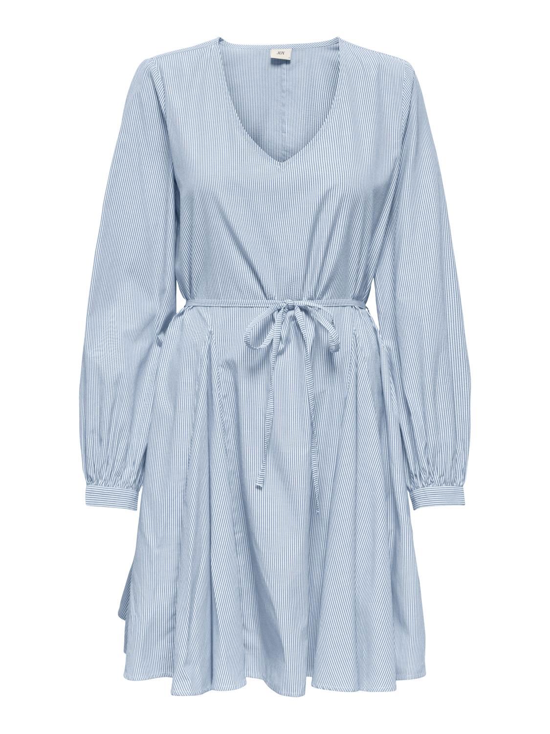 Kjole med v-hals og lange ermer. Knytebelte i midjen.