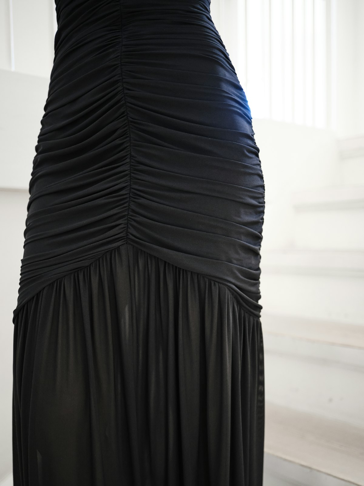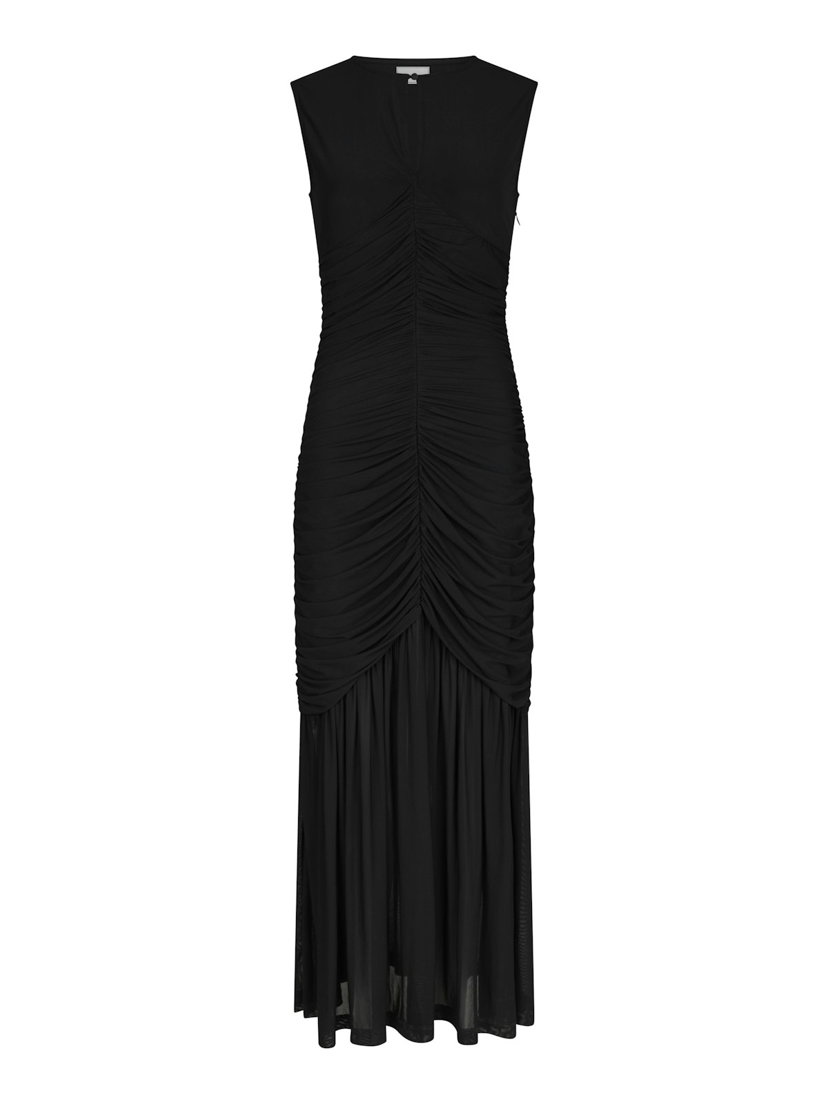 Fin lang meshkjole med smock langs sidesømmen og foran fra under brystet. Modellen er 176 cm høy og har på seg størrelse 36.