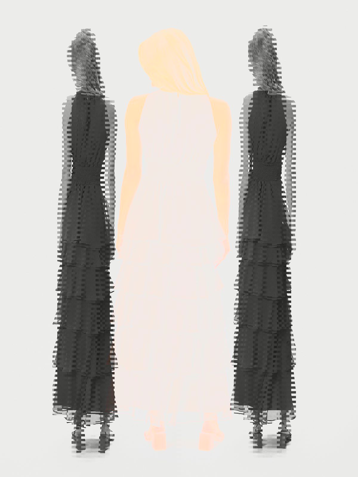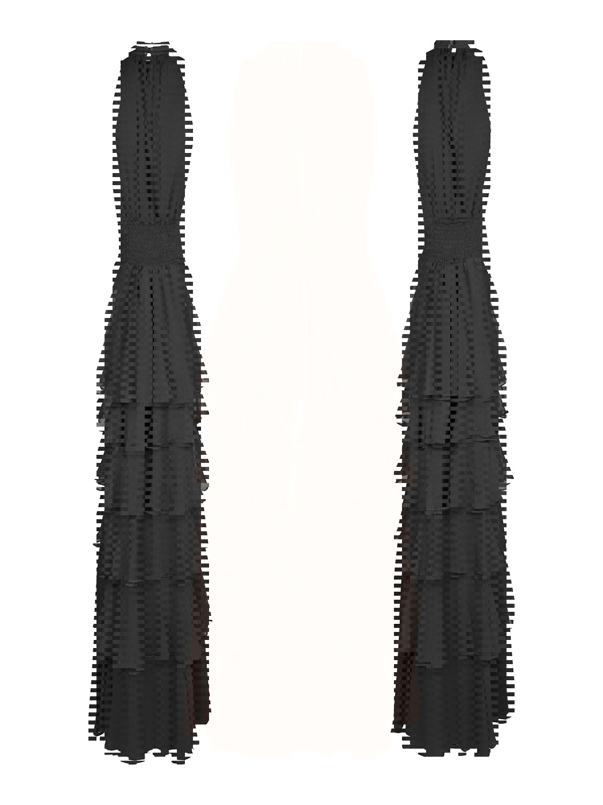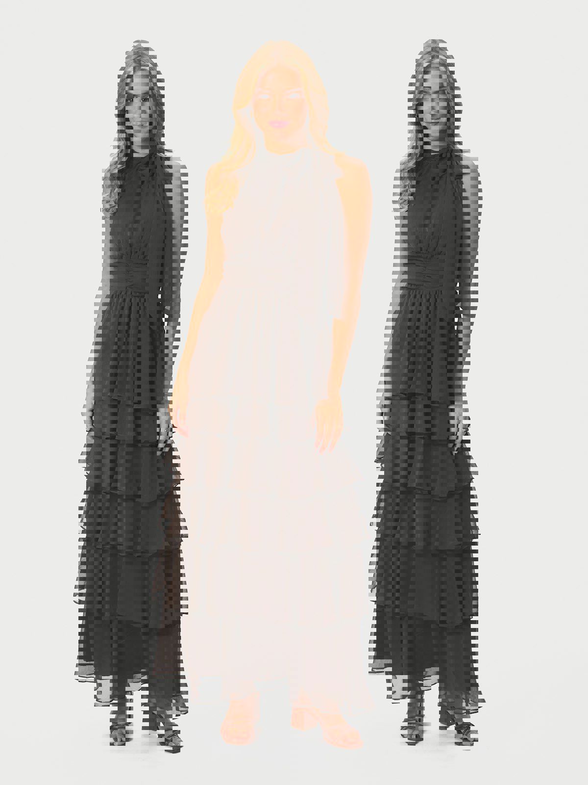 Fin lang kjole med halterneck og sløyfebånd ved halsen. Kommer i en fin chiffon kvalitet. Modellen er 176 cm høy og bruker størrelse 36.