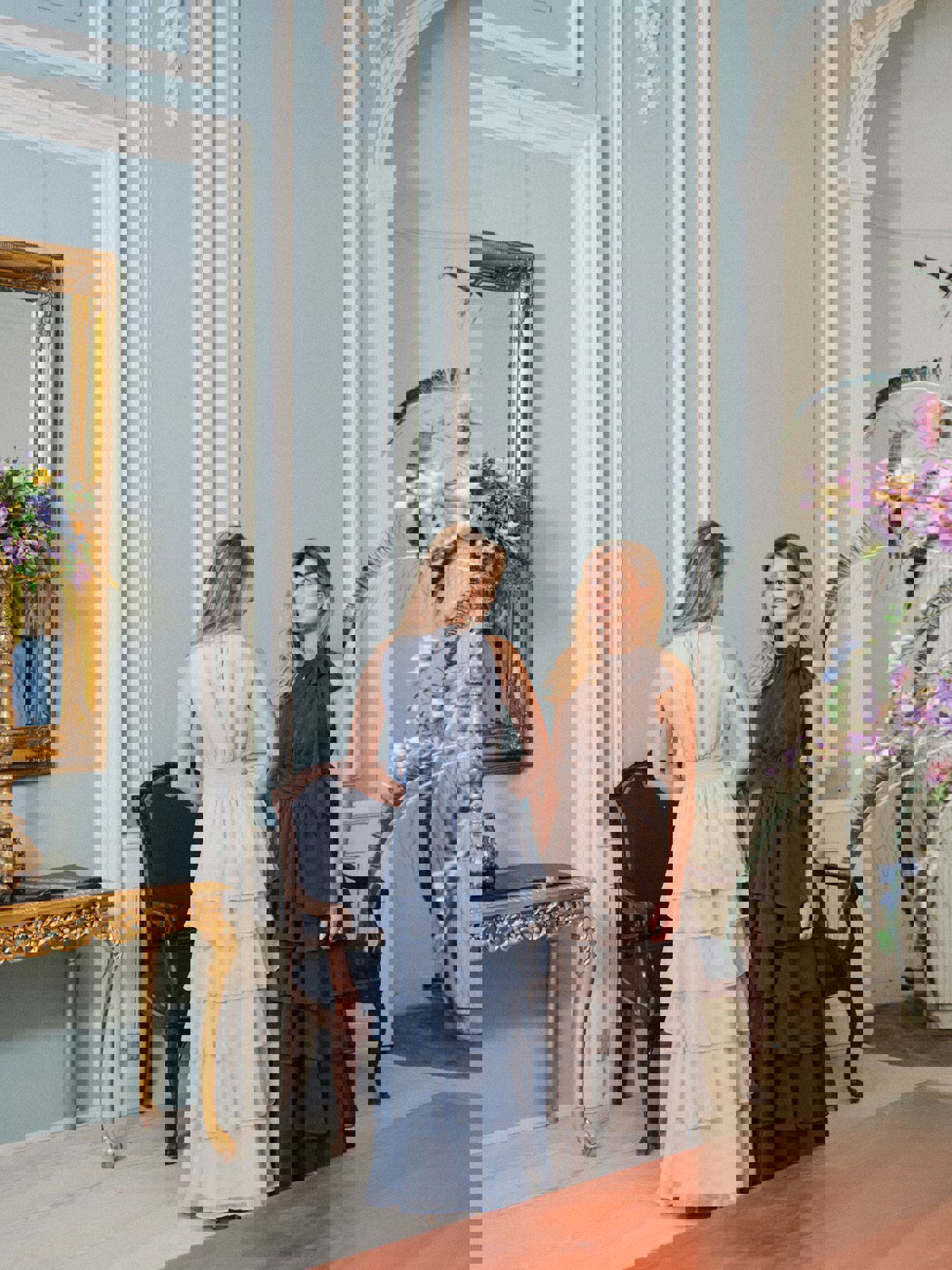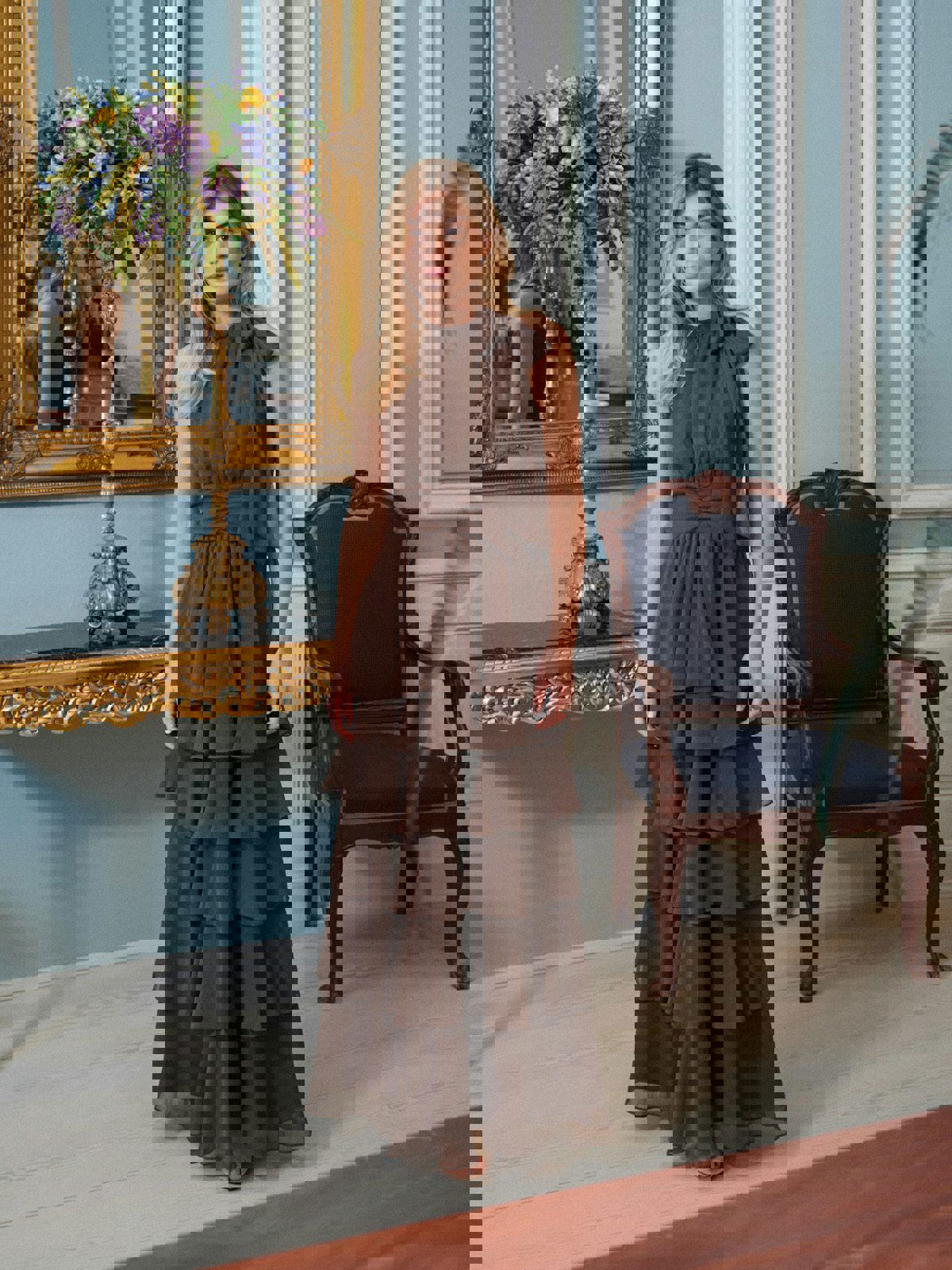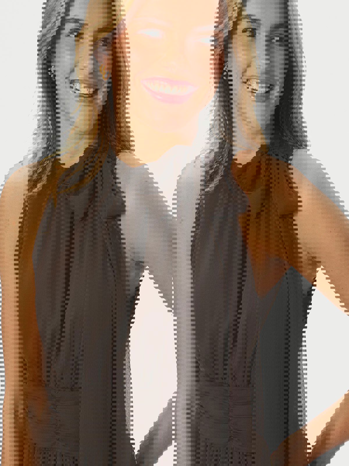Fin lang kjole med halterneck og sløyfebånd ved halsen. Kommer i en fin chiffon kvalitet. Modellen er 176 cm høy og bruker størrelse 36.