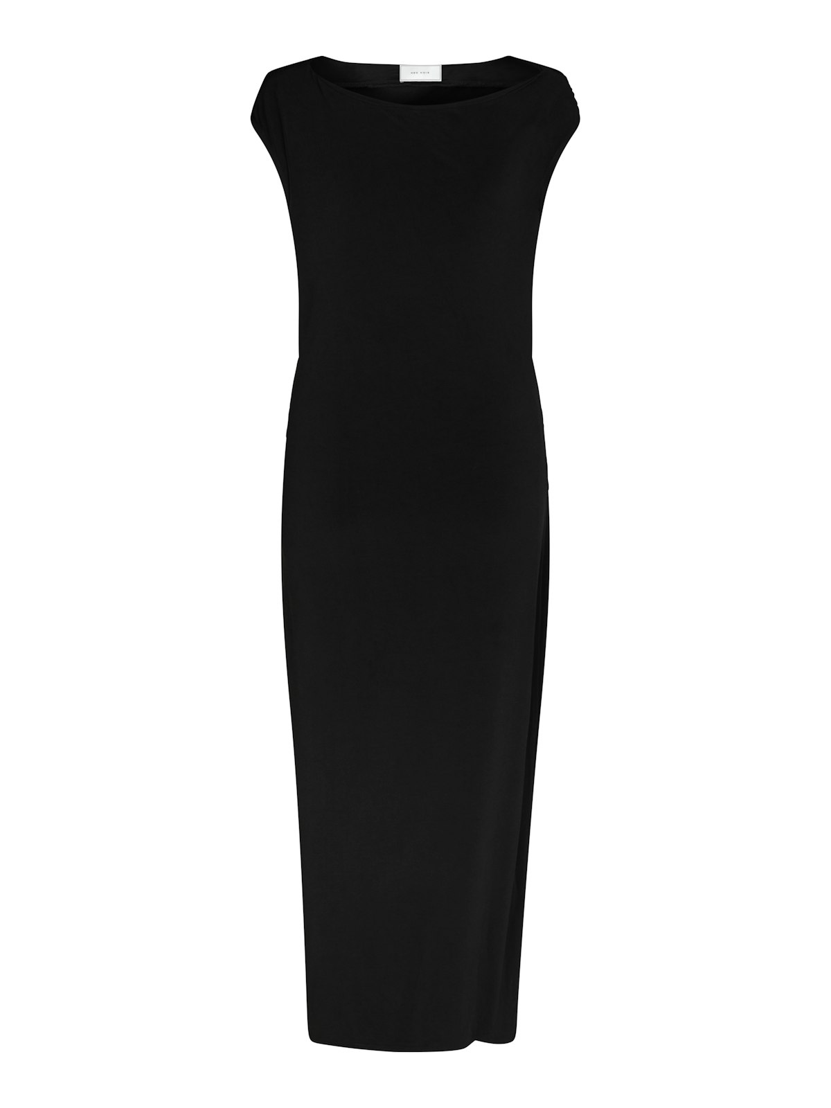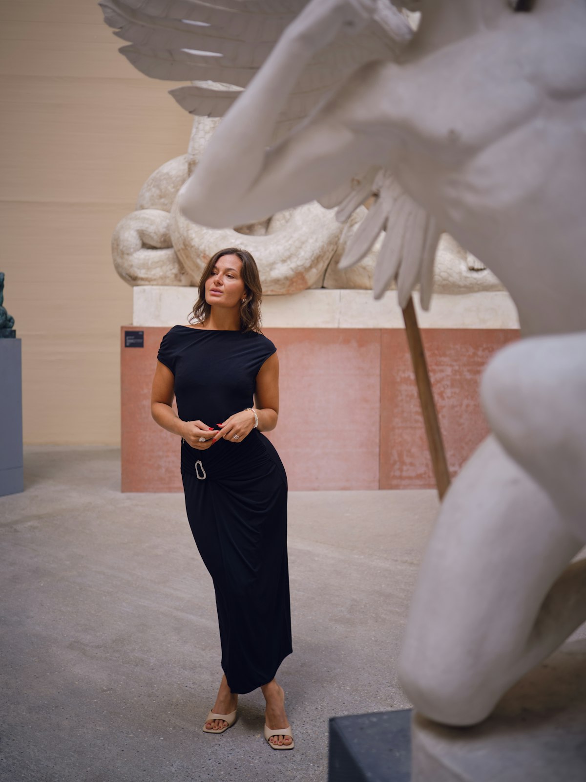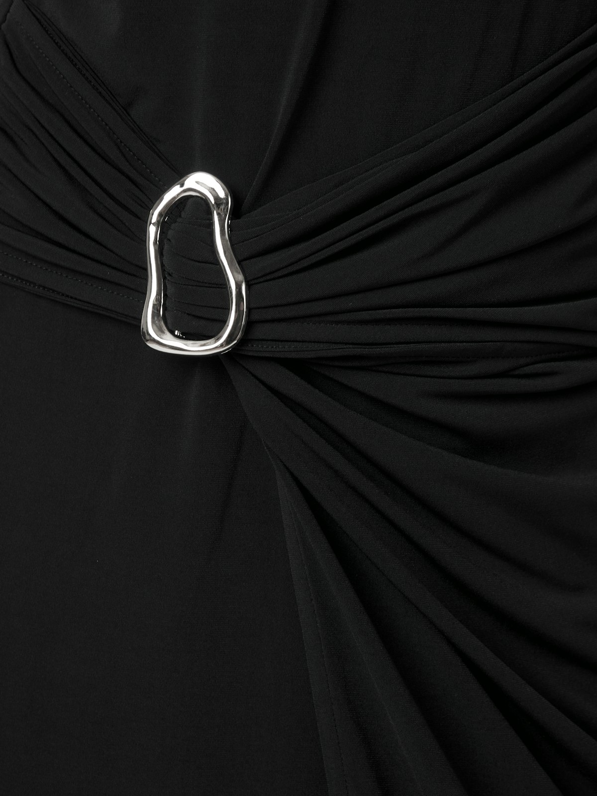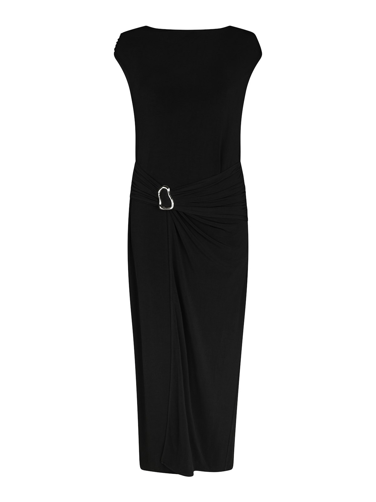 Vakker og elegant kjole med draperinger. Kjolen har et ekstra lag med stoff foran som holdes sammen av en vakker sølvspenne. Modellen er 176 cm høy og har på seg størrelse 36.