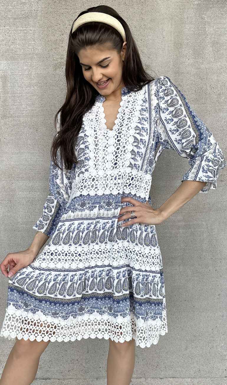 Superfin marineblå kjole med fint mønster. Blodedetaljer og strikk i midjen. God passform, vanlig + i størrelsen.