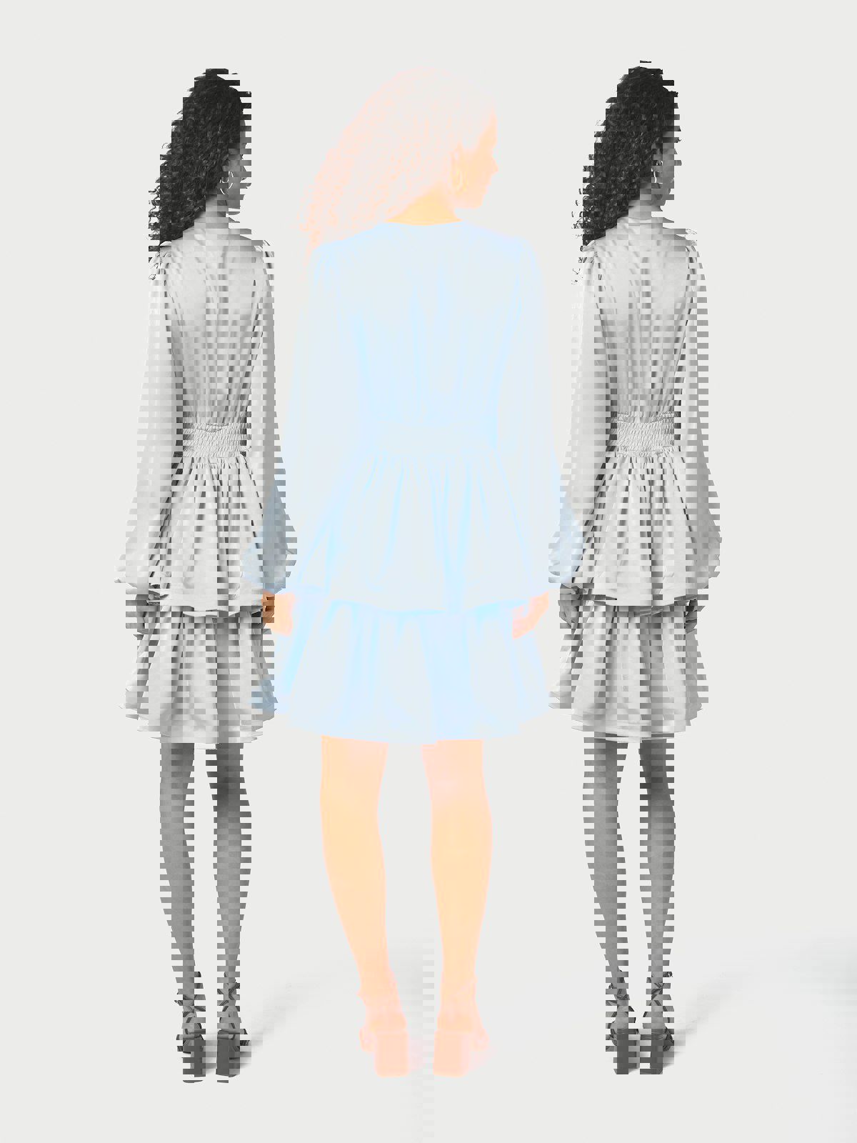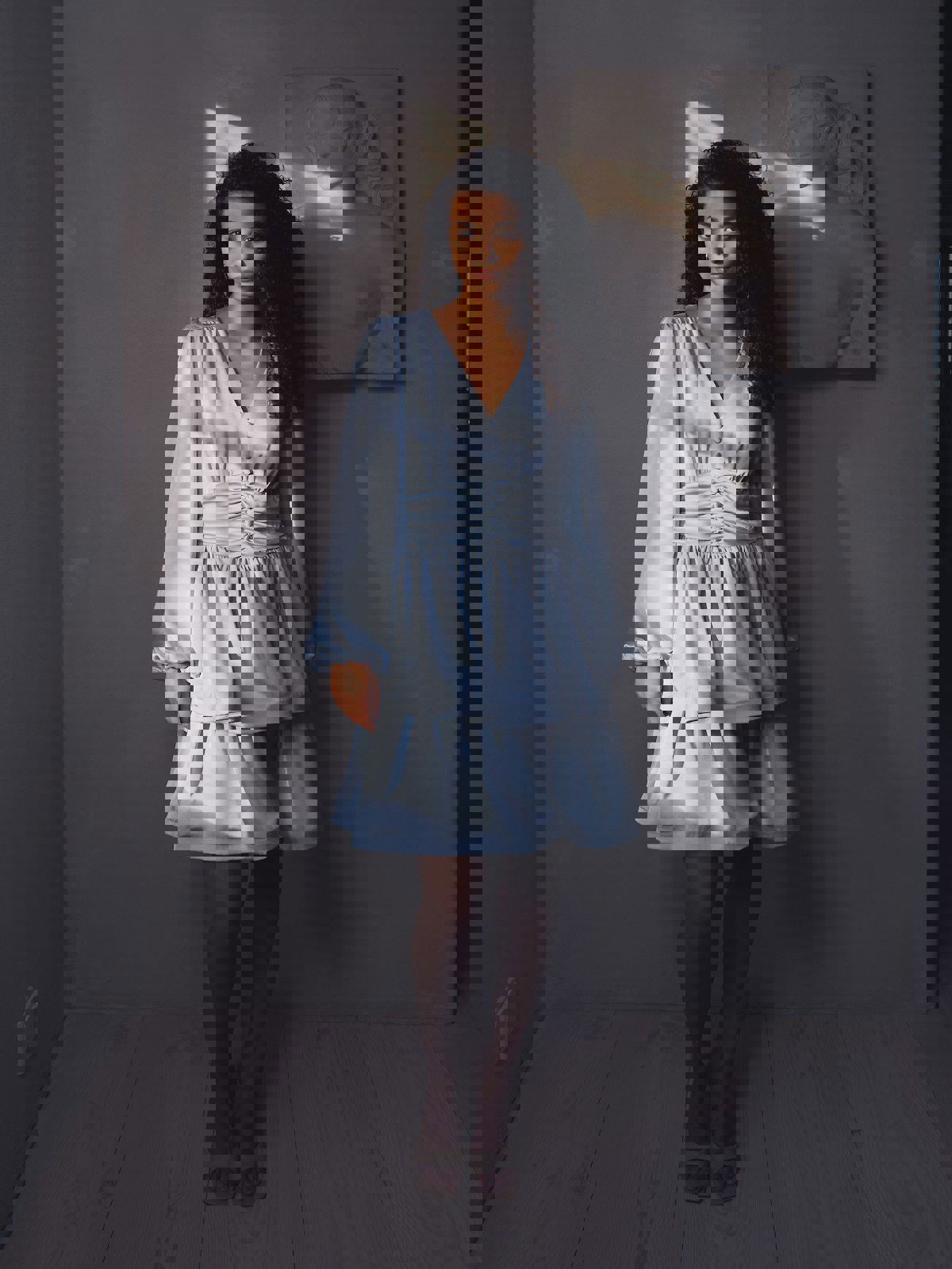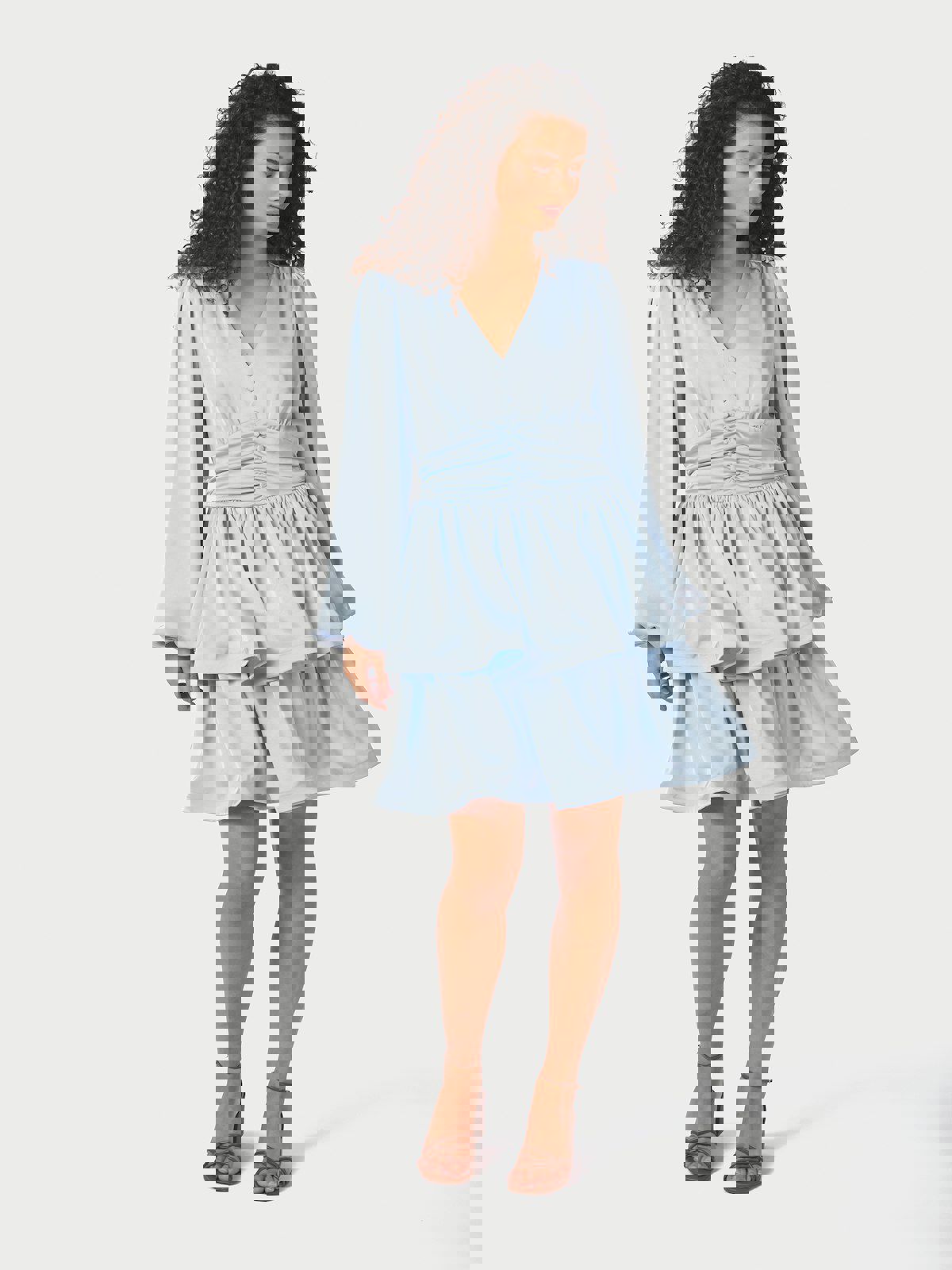 Søt kort kjole med lange ermer, i en fin tung satengkvalitet, og med en volangskjørt. Modellen er 176 cm høy og bruker størrelse 36.