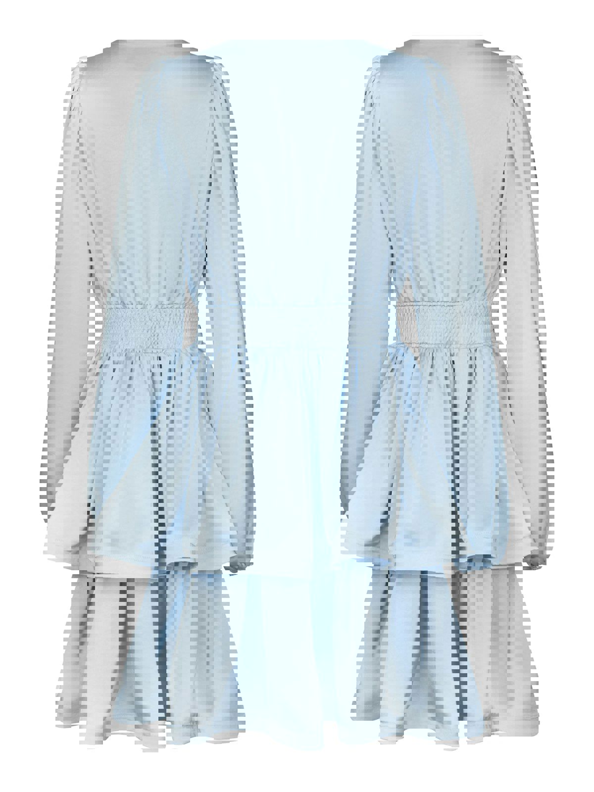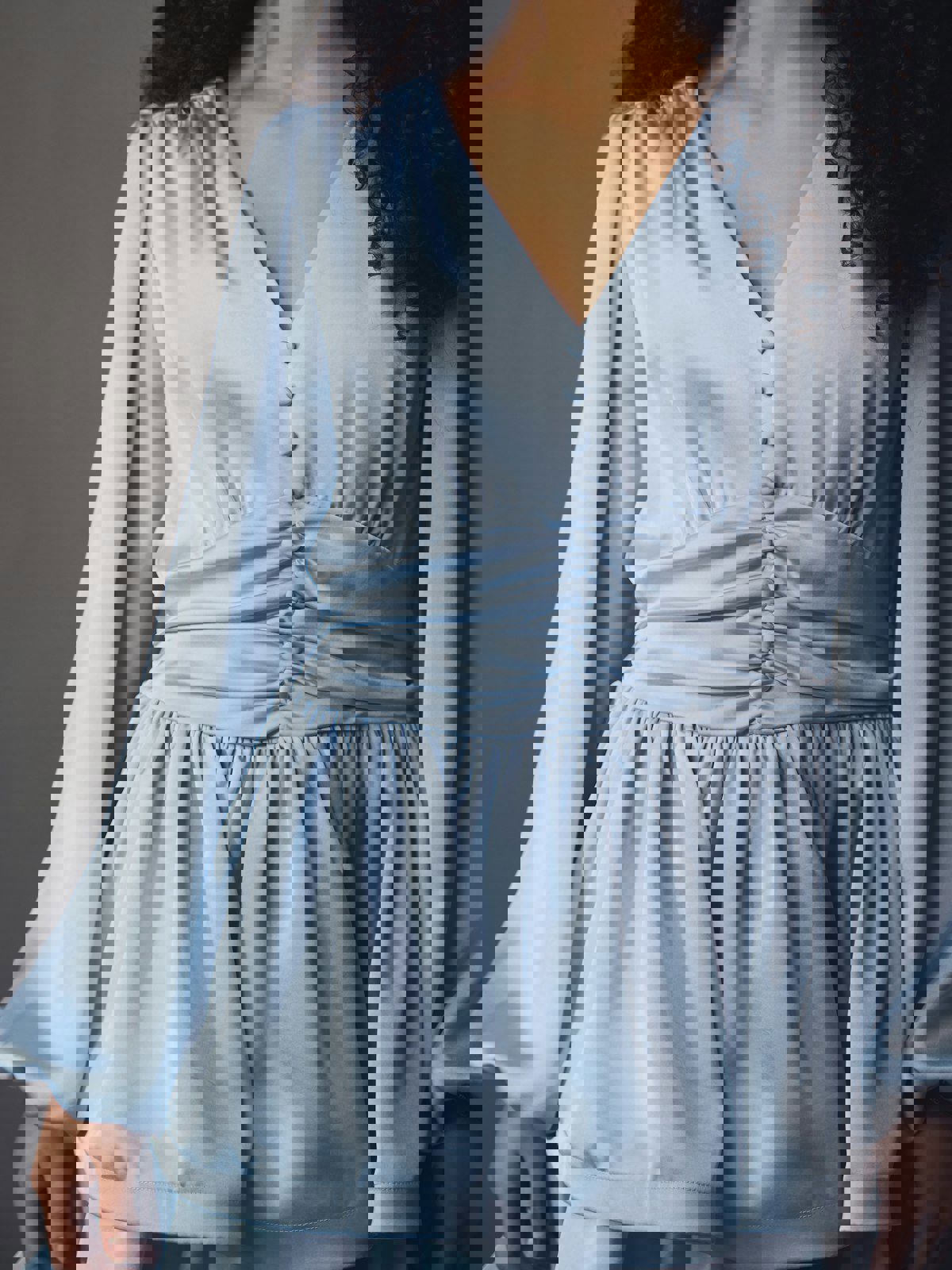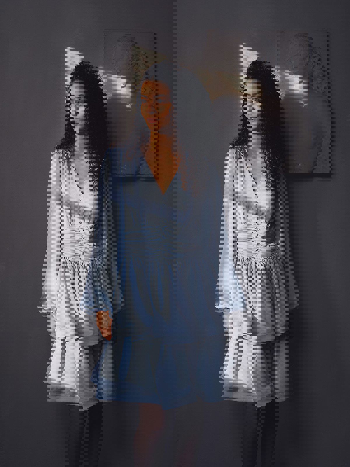 Søt kort kjole med lange ermer, i en fin tung satengkvalitet, og med en volangskjørt. Modellen er 176 cm høy og bruker størrelse 36.