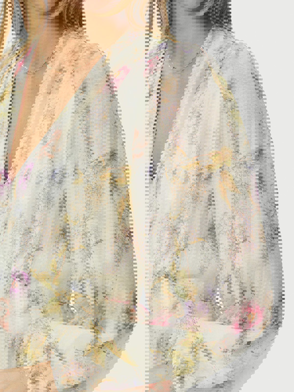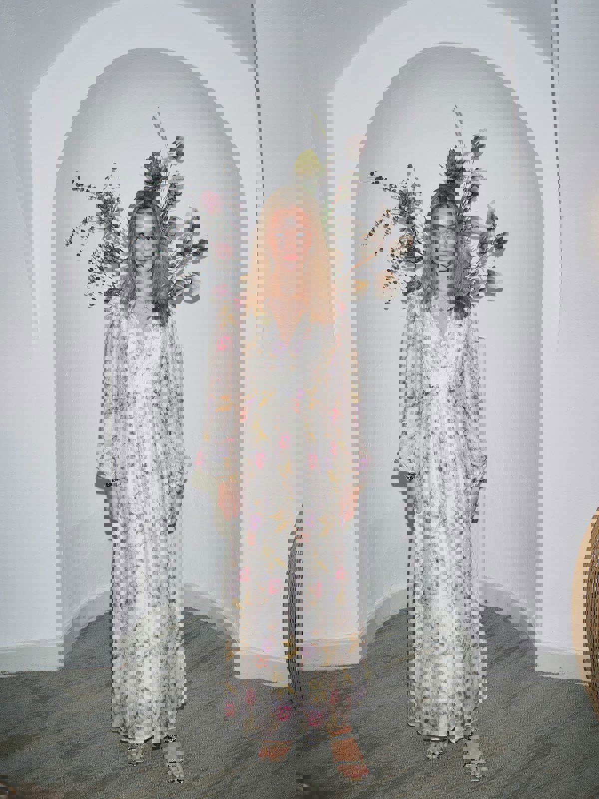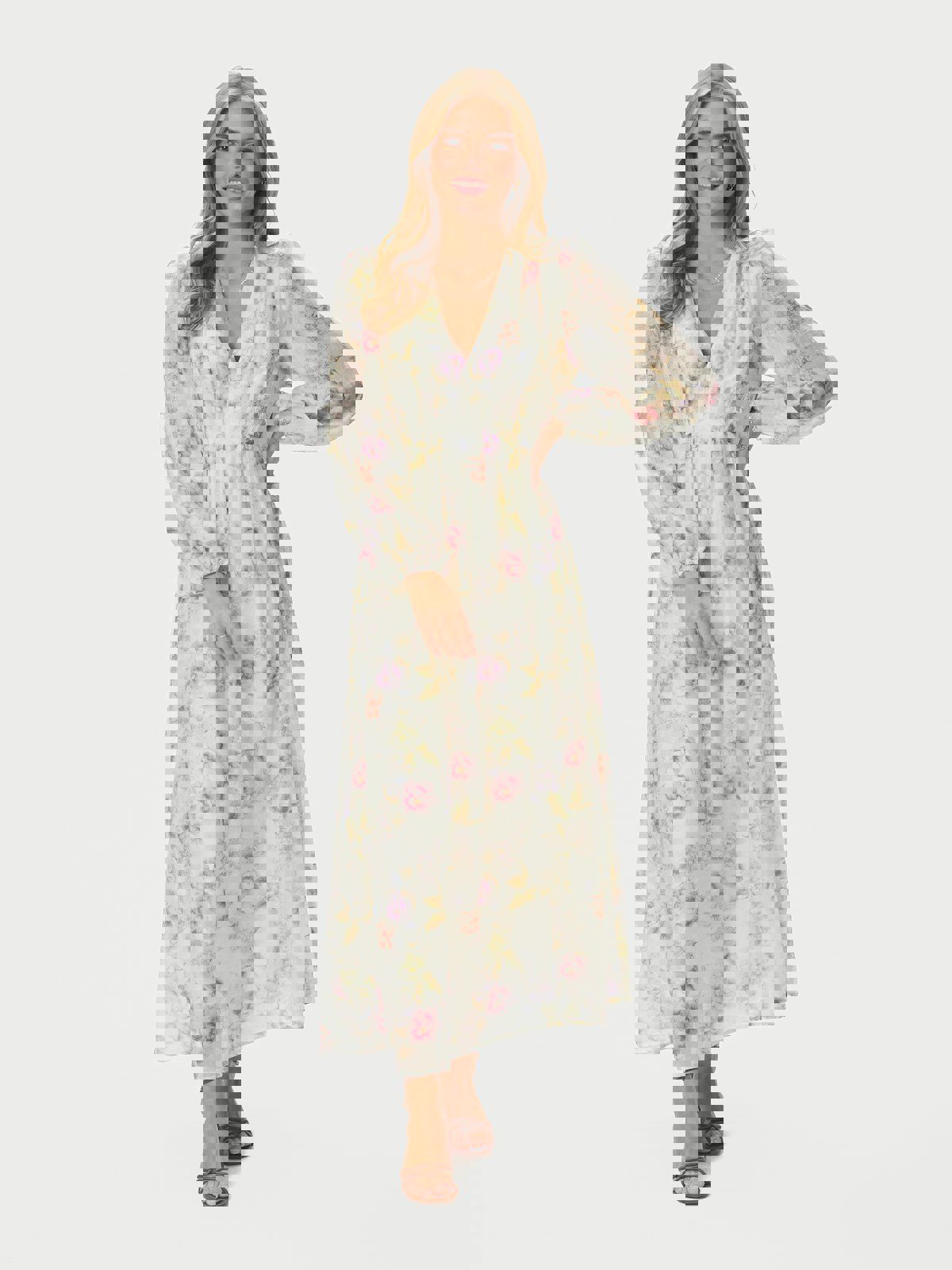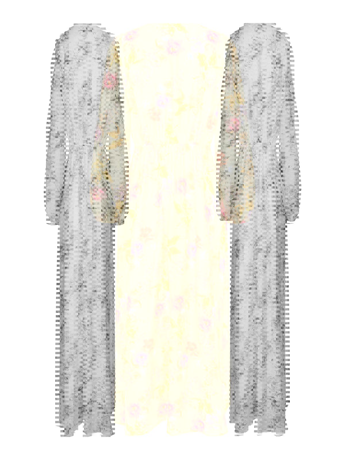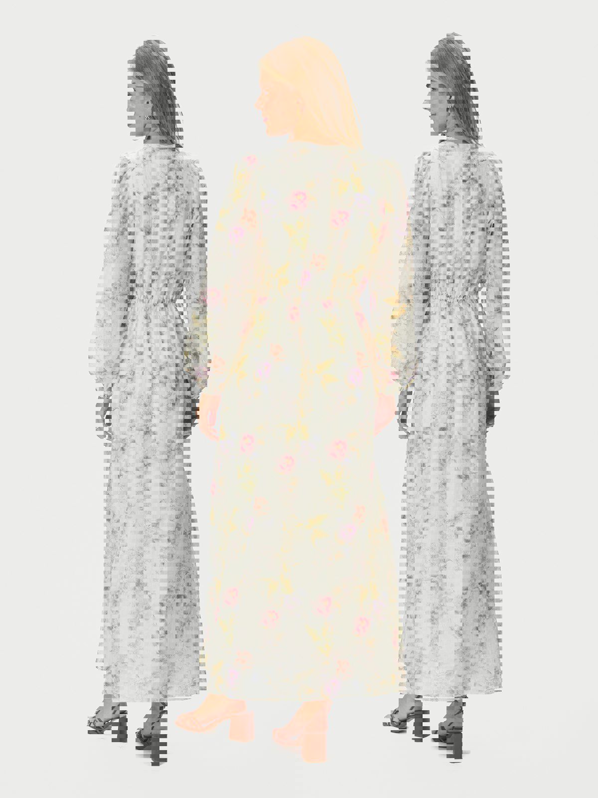 Maxi lengde kjole. Kjolen har en avslappet, men feminin passform. Ermene er lange og avsluttet med elastikk. Modellen er 176 cm høy og bruker størrelse 36.