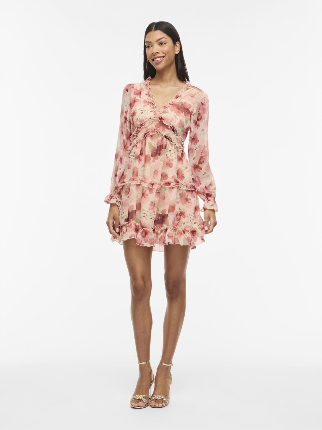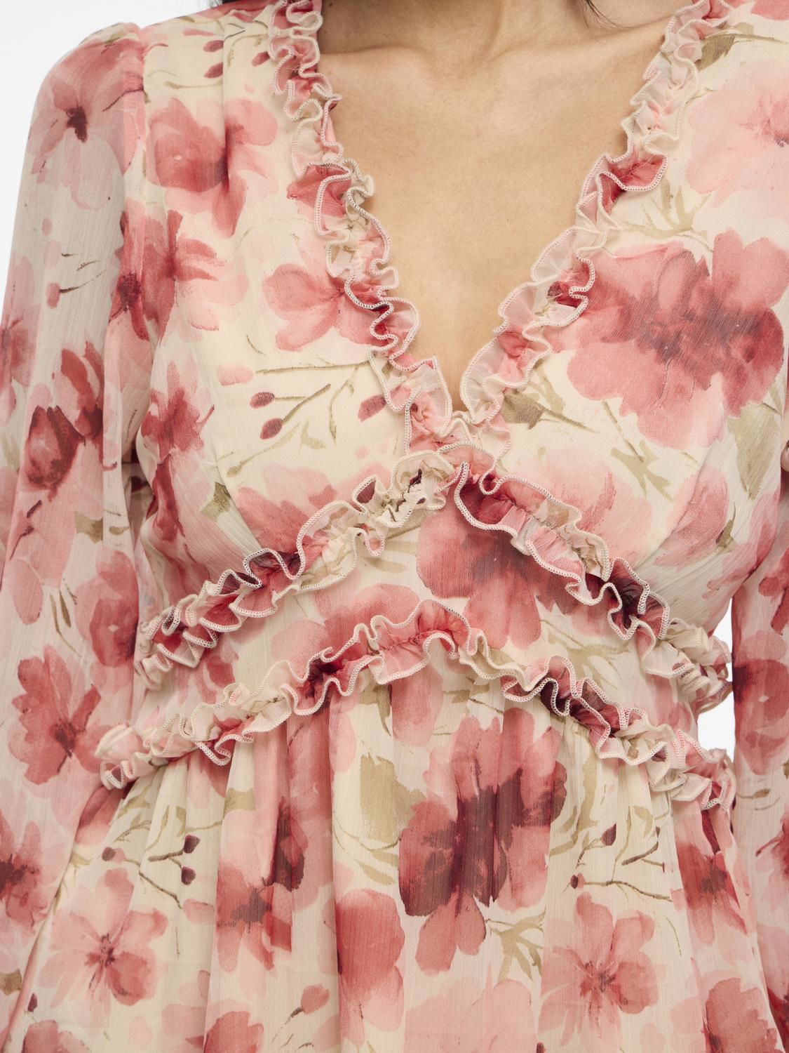 Kjole med fin passform, v-hals og koselig blomsterprint.