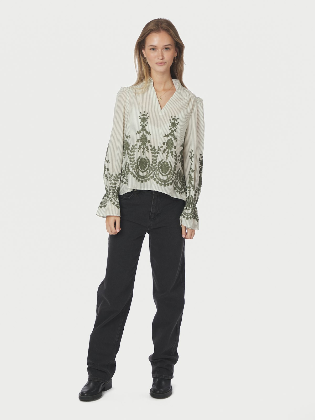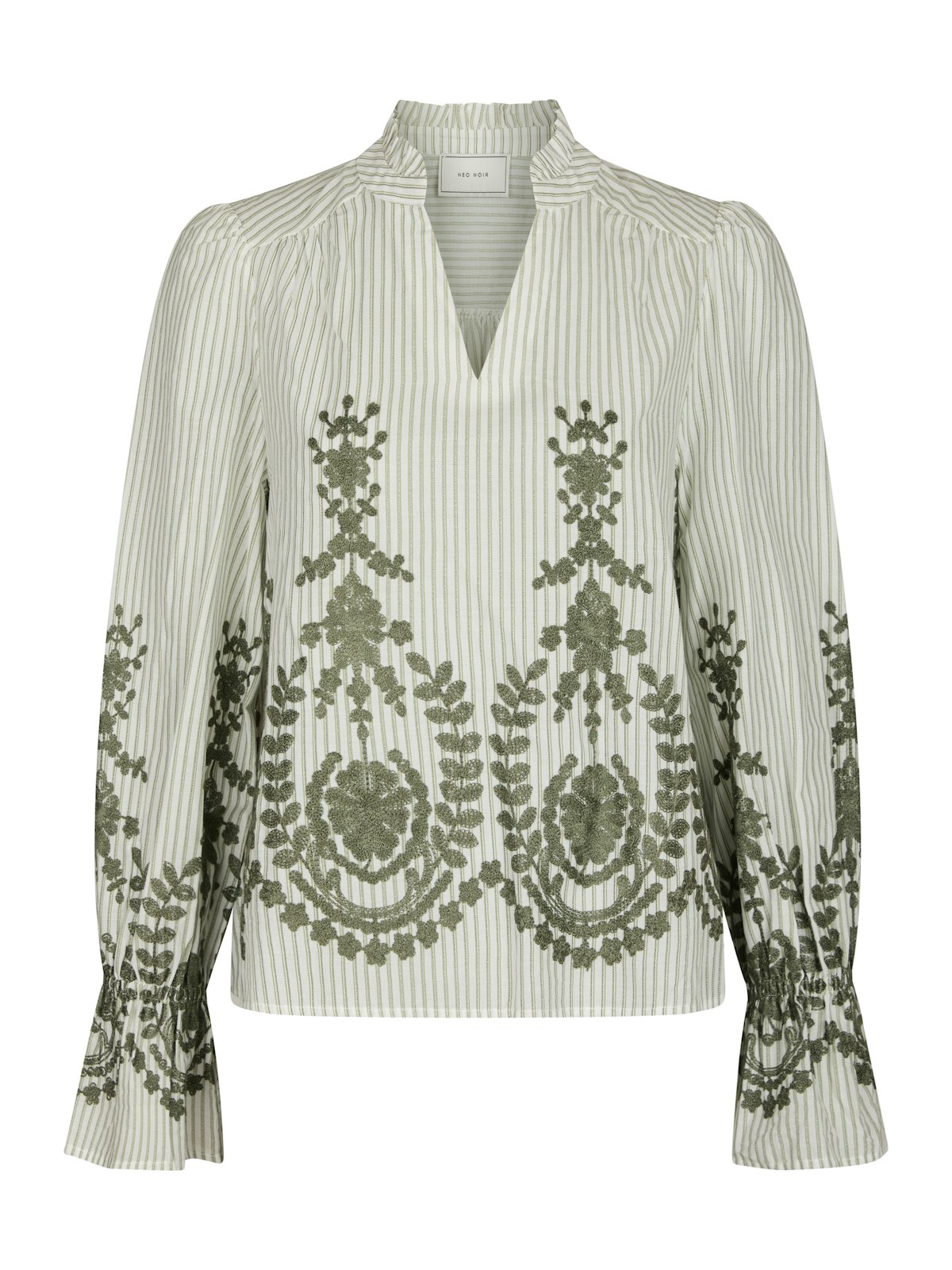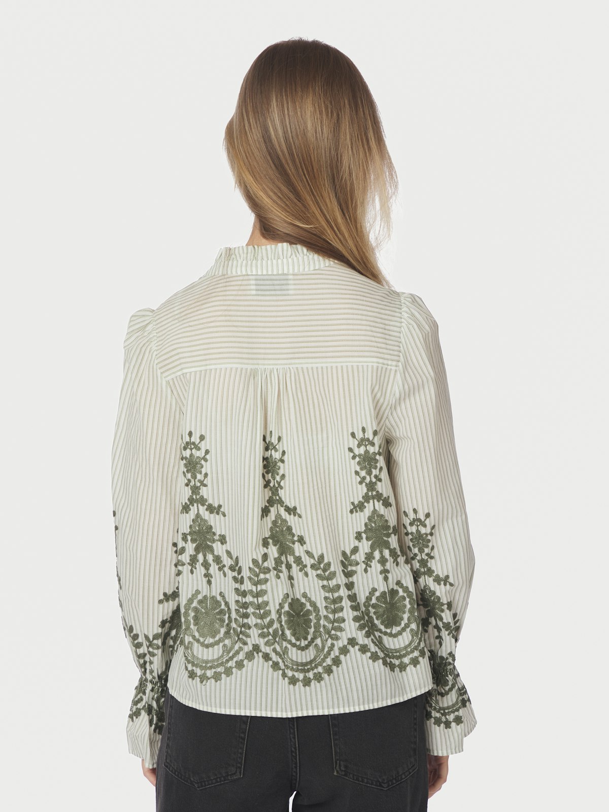 Amara Stripe Emb Blouse er en stilfull og komfortabel bluse i en delikat støvet grønnfarge. Den perfekte kombinasjonen av bomull og polyester gir en myk følelse mot huden, samtidig som den er lett å vedlikeholde. Denne blusen er ideell for hverdagsbruk og kan enkelt styles med forskjellige underdeler.