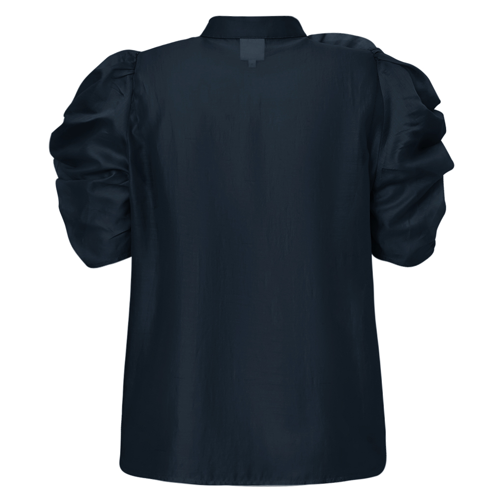 AnnsofieGO Blouse er en vakker bluse med korte ermer som har en distinkt puffet effekt, noe som gir en dramatisk og moderne silhuett. Ermene er voluminøse og skaper et stilig utseende. Blusen har en høy hals som lukkes med en knapp foran og en svært dekorativ blomst på den ene siden.
