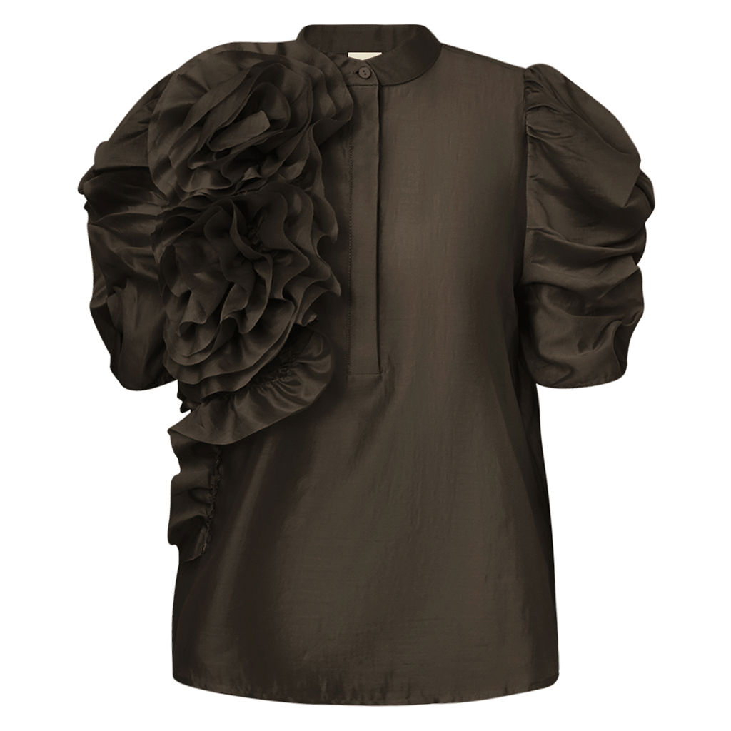AnnsofieGO Blouse er en vakker bluse med korte ermer som har en distinkt puffet effekt, noe som gir en dramatisk og moderne silhuett. Ermene er voluminøse og skaper et stilig utseende. Blusen har en høy hals som lukkes med en knapp foran og en svært dekorativ blomst på den ene siden.