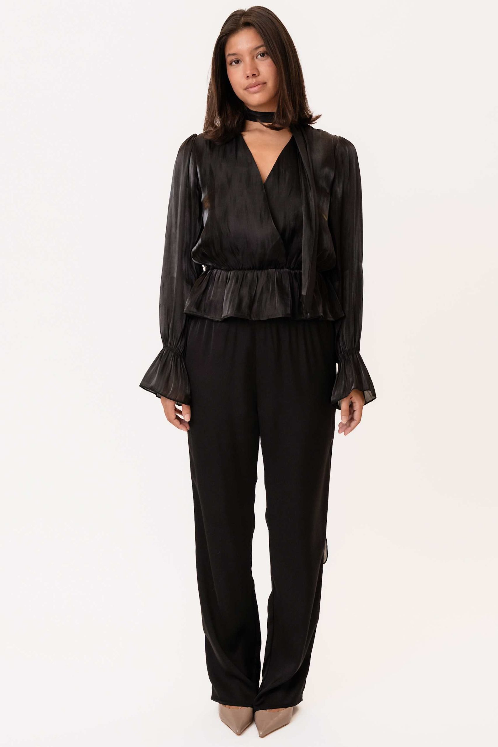 En fantastisk bluse i en myk champagnefarge. Blusen har en avslappet passform med en definert midje, lange ermer og en dyp V-hals med omslagsdetalj og delikate rysjer. De lange ermene er avsluttet med elastiske mansjetter, noe som skaper en subtil rysje og gir ermene en mykt puffet silhuett. Blusen har et knytebelte som kan bæres i midjen eller styles som et halstilbehør for et ekstra preg.