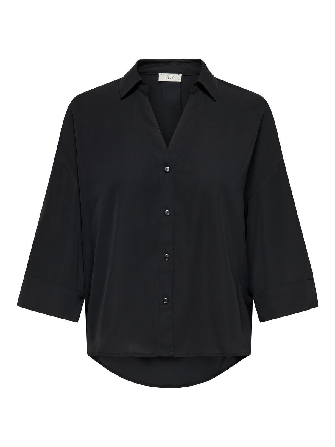 Sort bluse med 3/4-dels lange ermer og v-hals. Løs og ledig passform.