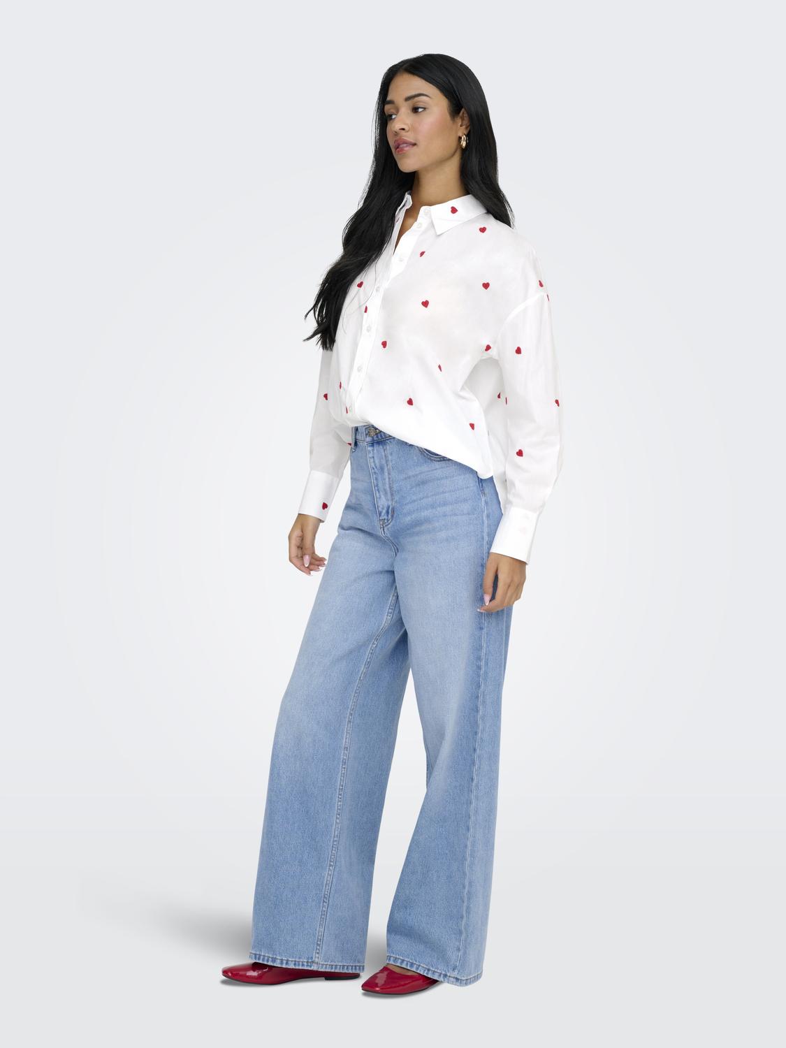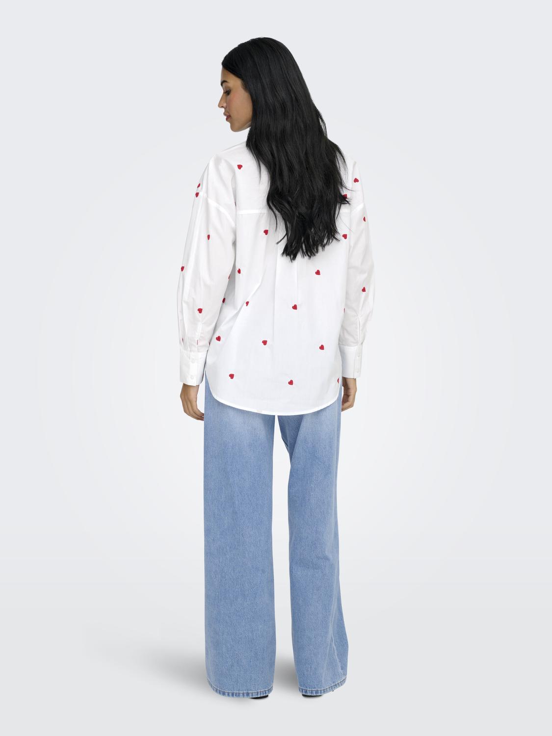 Hvit skjorte med røde broderte hjerter.