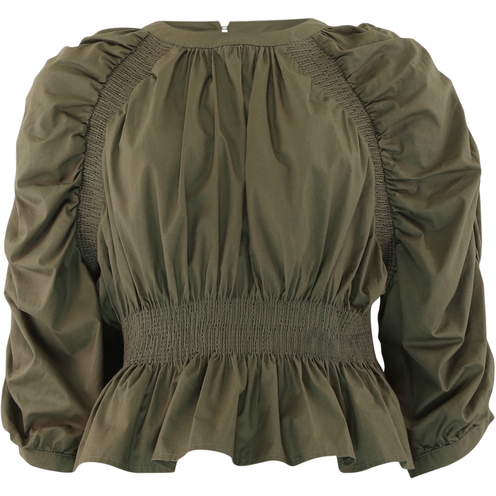 Grønn bluse/topp med fine detaljer, strikk i midjen.