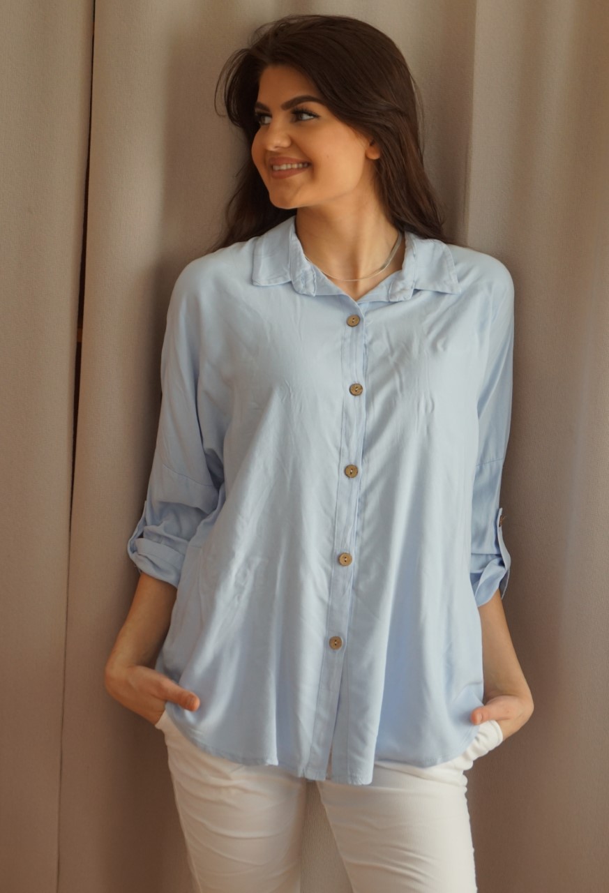 Lyse blå bluse i 100% viskose. Blusen er i èn størrelse og har armer til å brette opp!