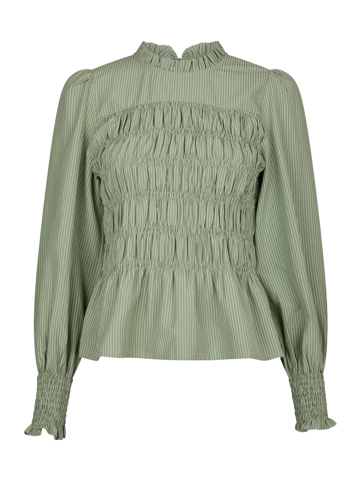 Langermet bluse med smock langs kroppen som starter fra brystet. Modellen er 176 cm høy og har på seg størrelse 36.