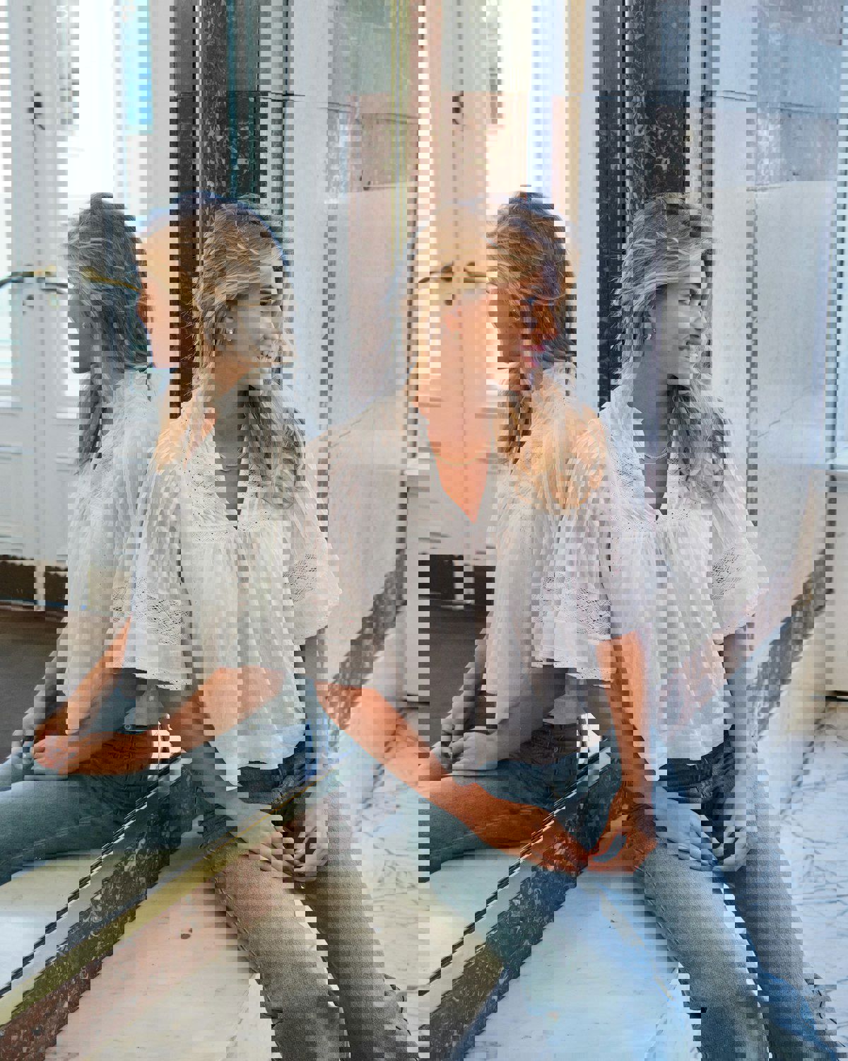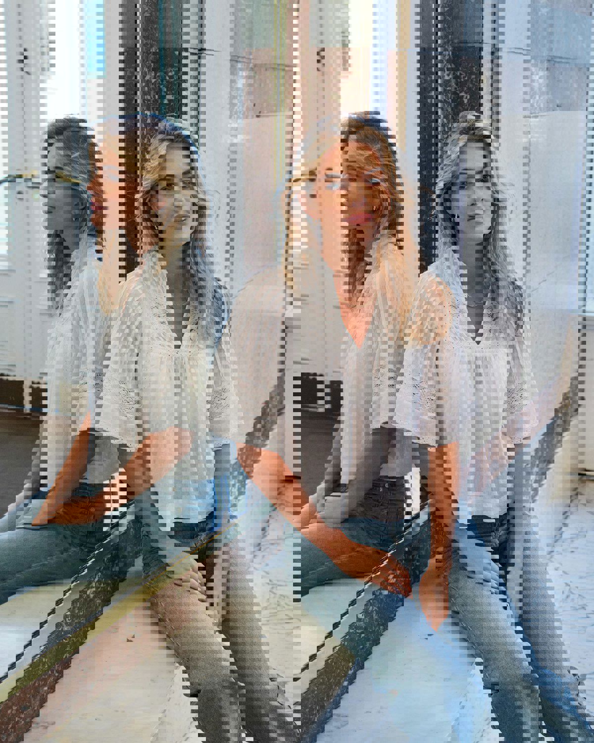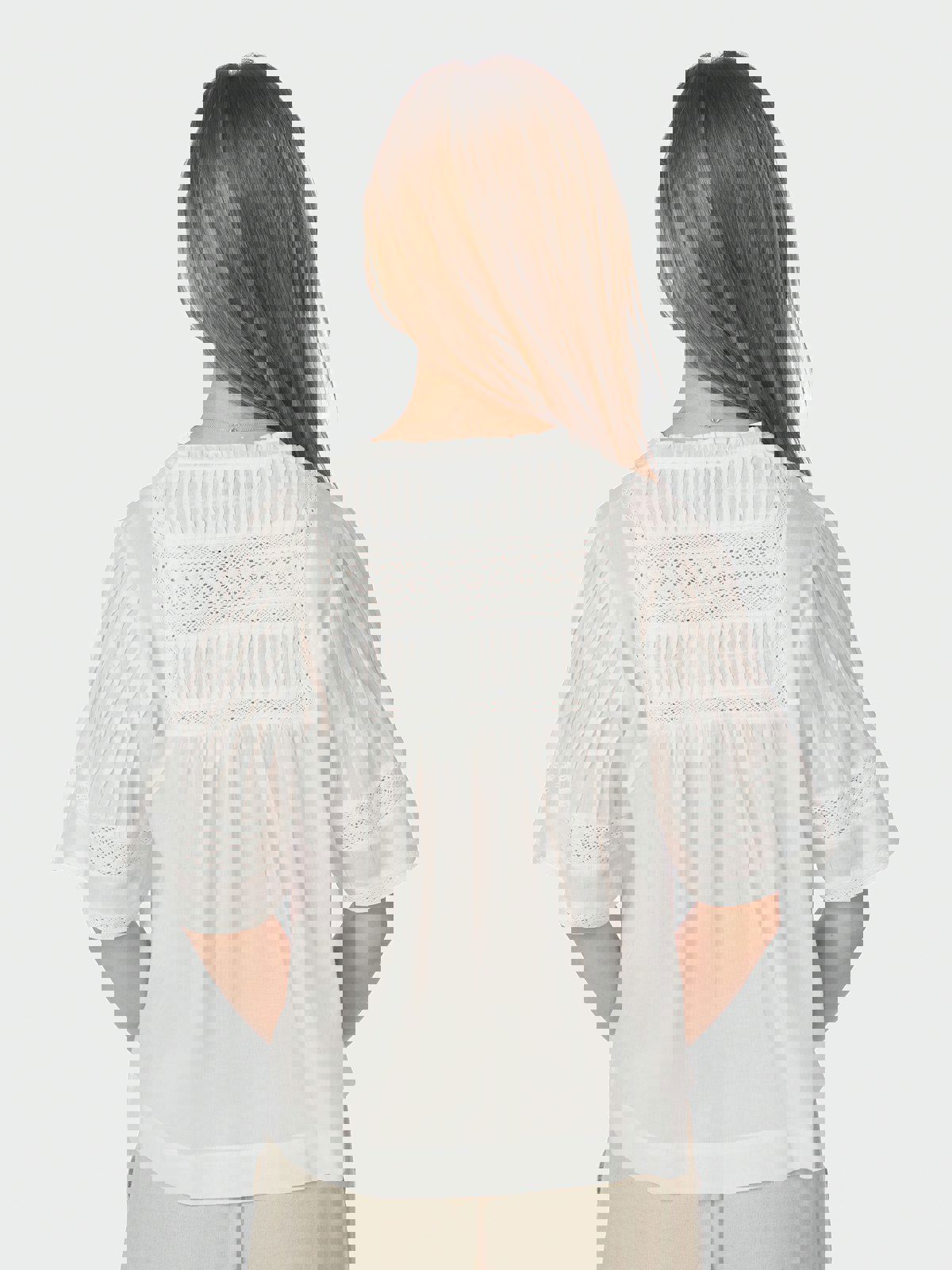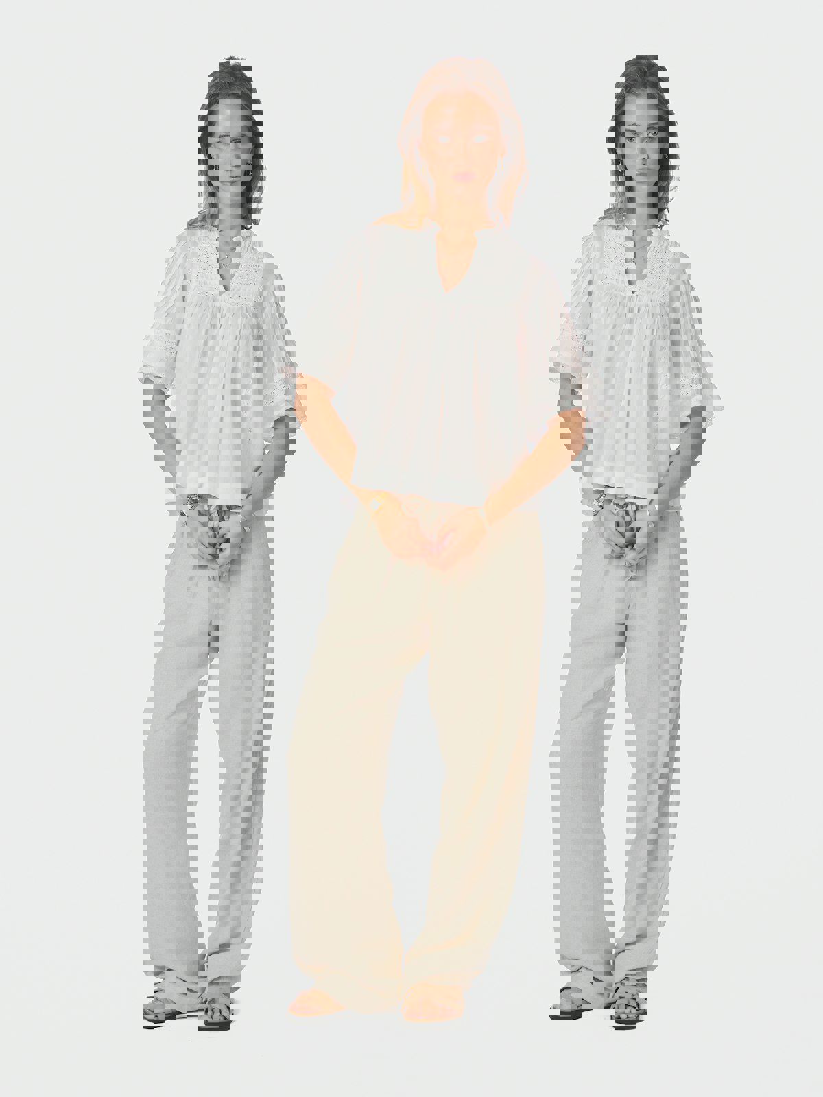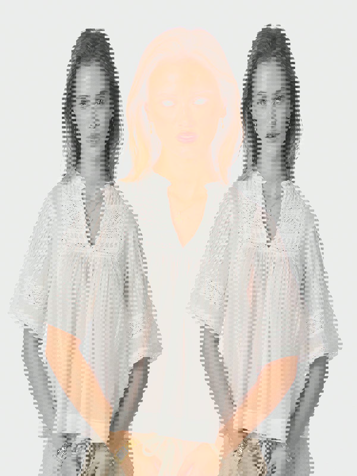 Dekorativ bluse med ermer som stopper over albuen og en feminin, men avslappet passform. Blusen har mange detaljer som båndinnsatser og små plisseringer, og kommer i en fin bomullskvalitet.