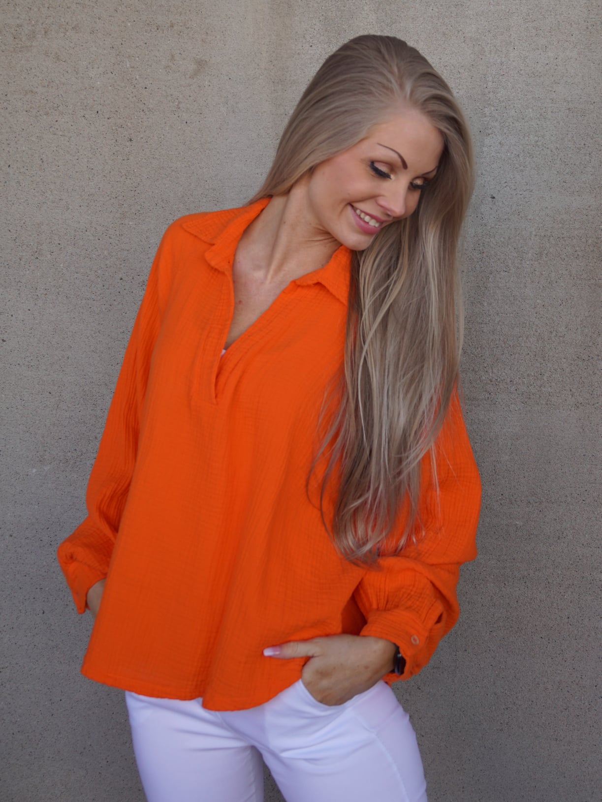Oransje bluse i herlig kreppkvalitet.