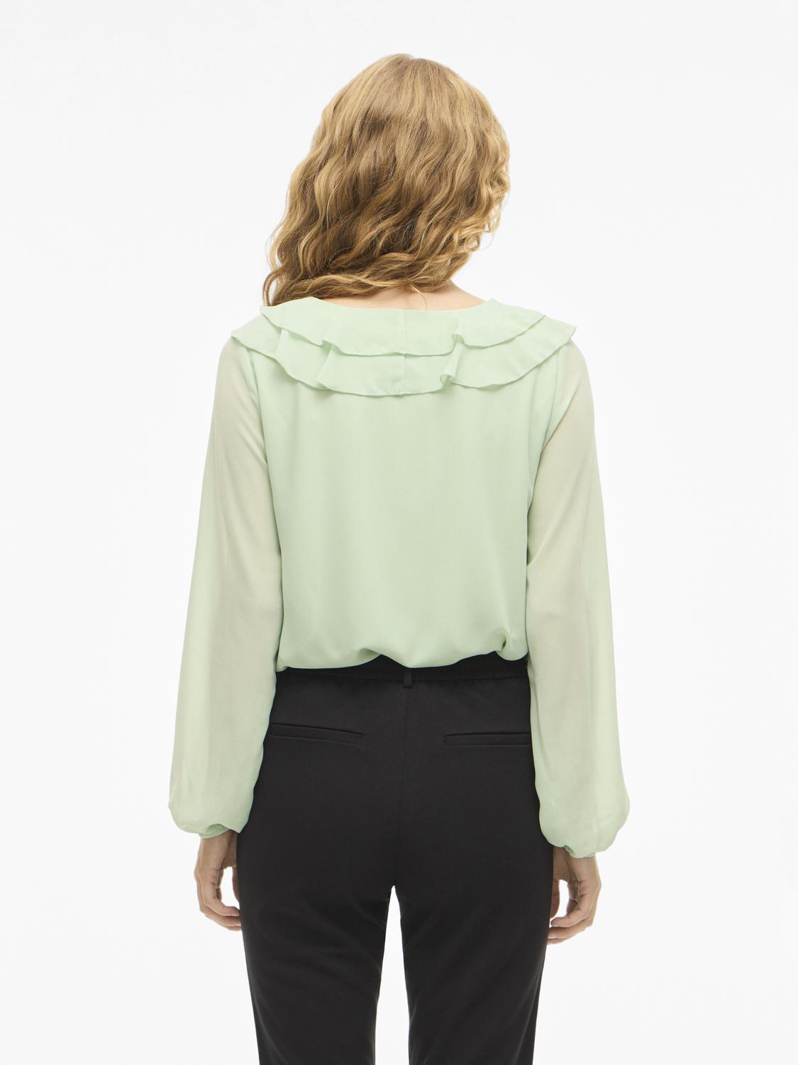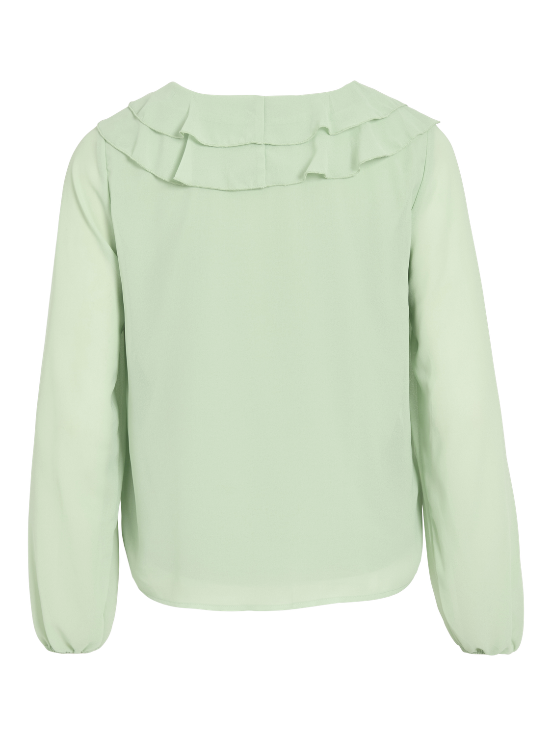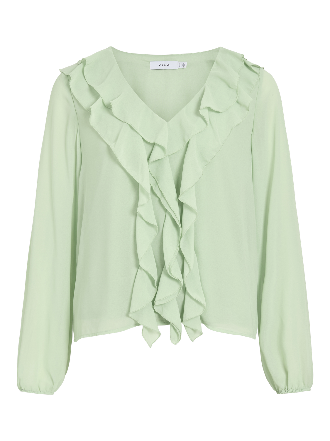 Lekker lys grønn bluse med volanger i front. Chiffong med fòret i bærestykket.