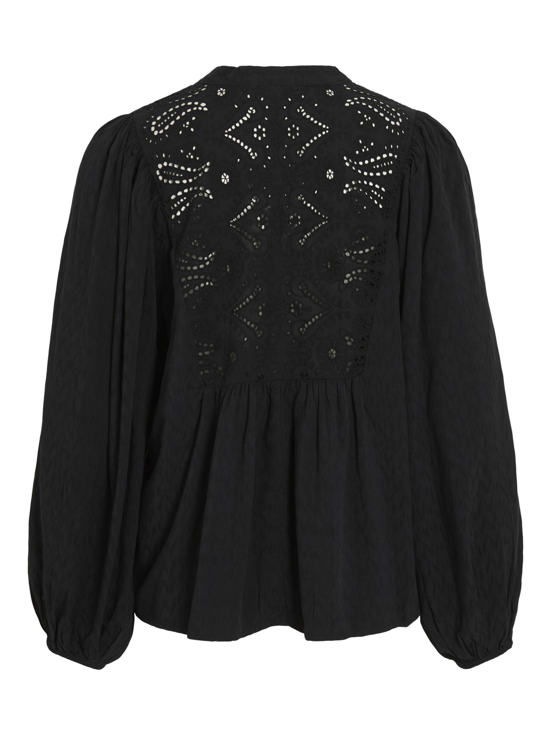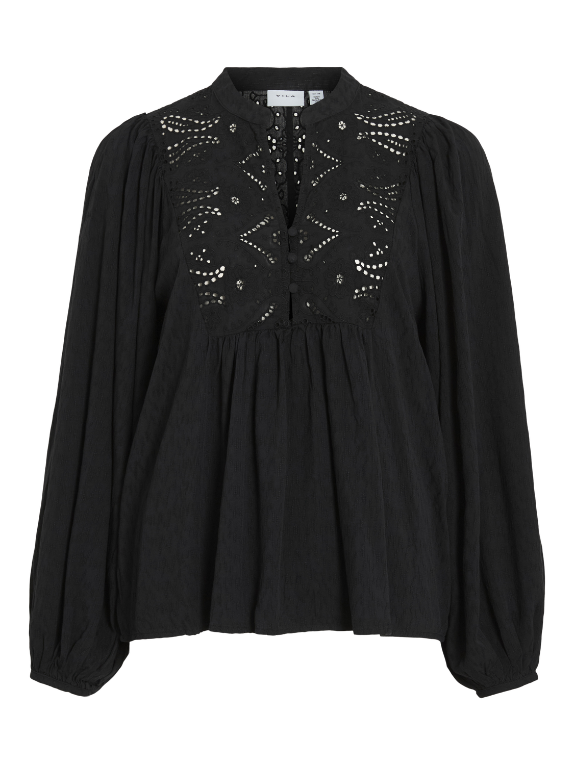 Bluse med lace-detaljer øverst. Løs og ledig passform.