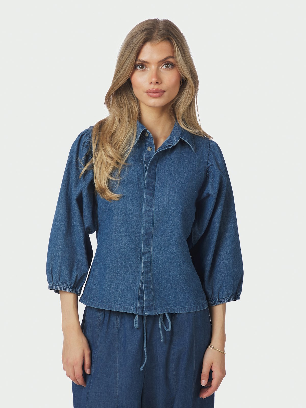 Denimbluse med puffermer og krage samt skjult knappestolpe foran.