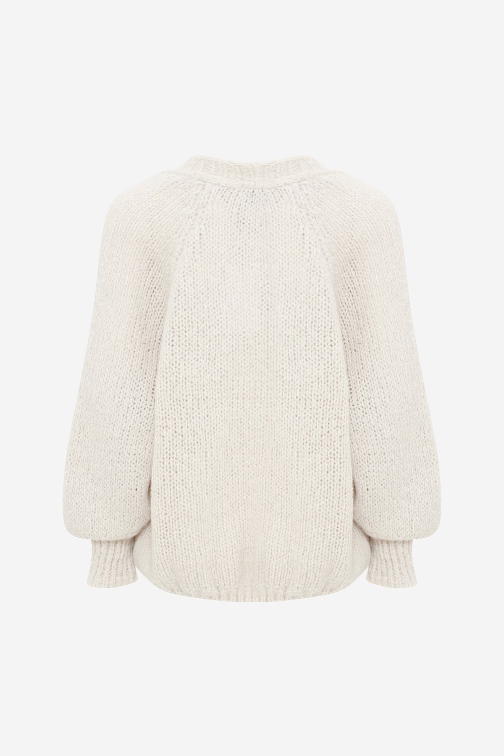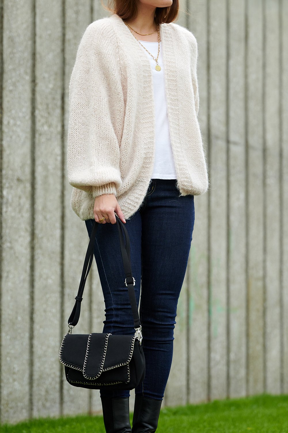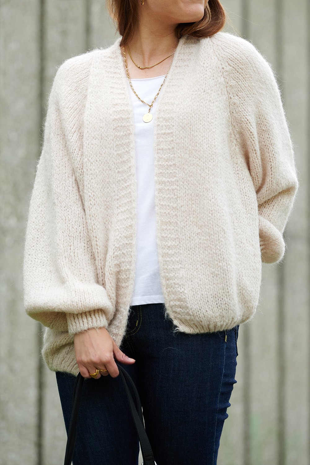 Superfin strikket cardigan fra Noella. Jakken har ballongermer og den har en bred ribbekant i ermene og langs kanten helt ned.