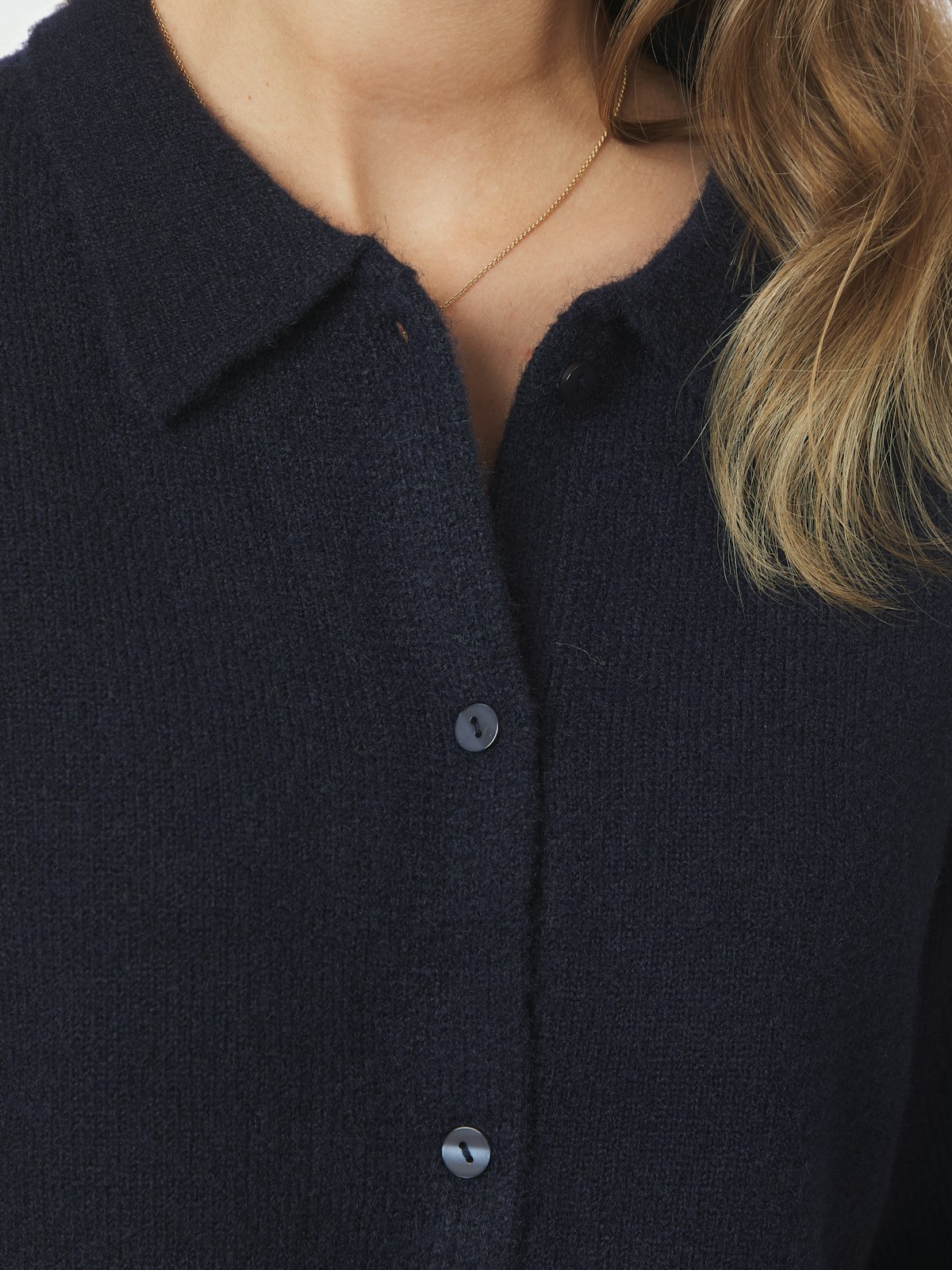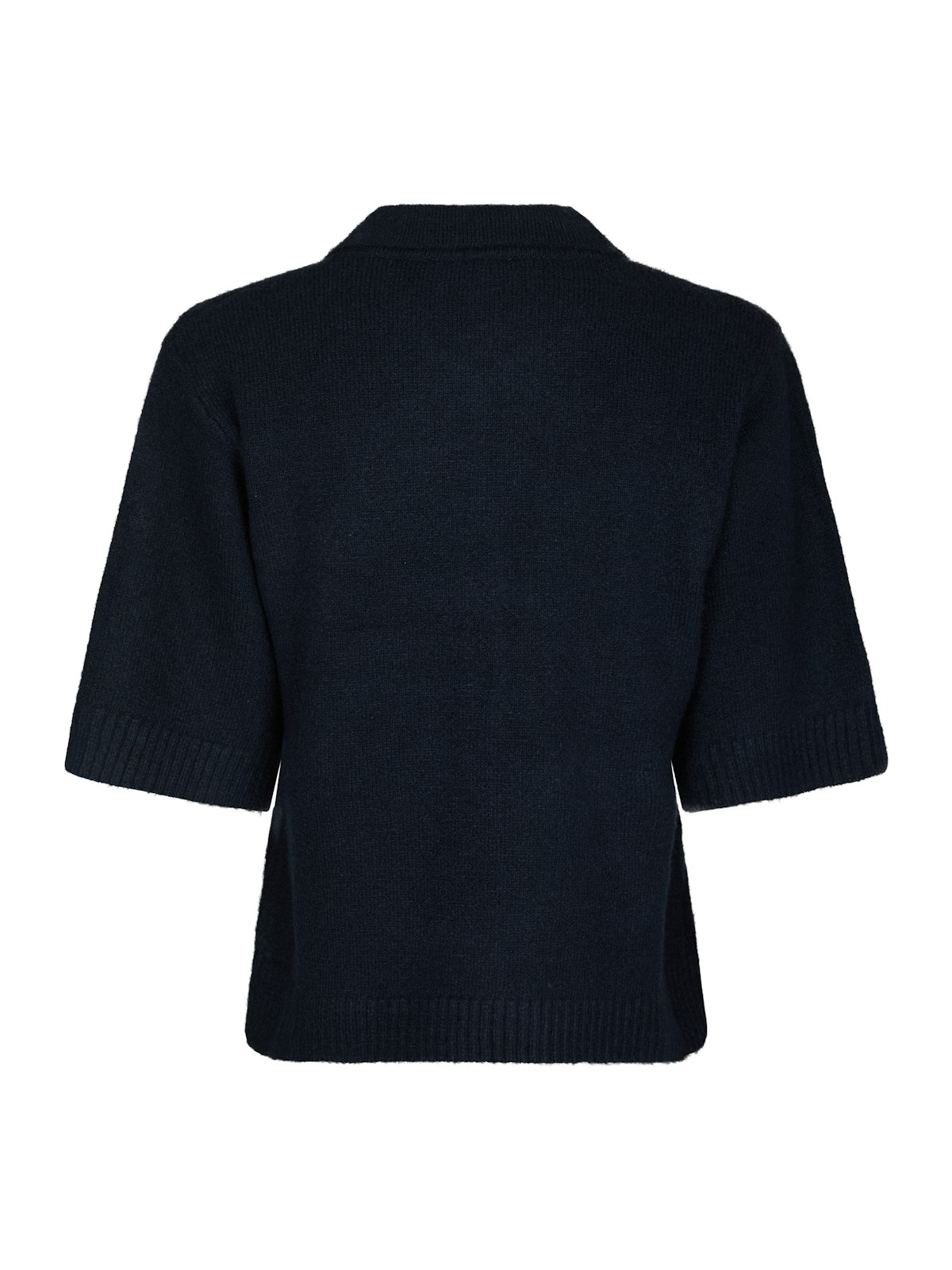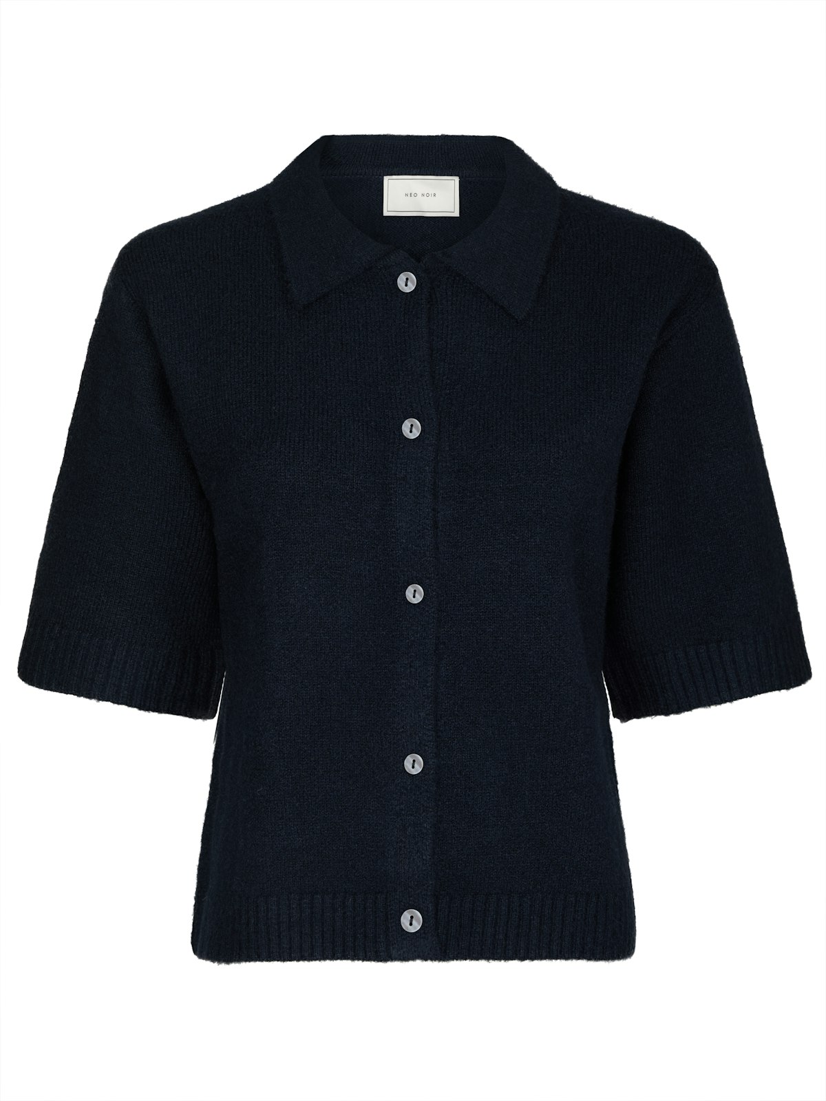Kortermet, strikket bluse med krage og knapper langs fronten. Modellen er 176 cm høy og bruker størrelse 36.