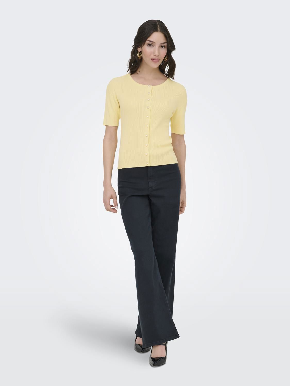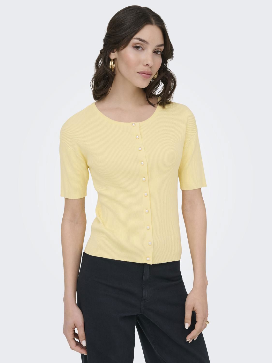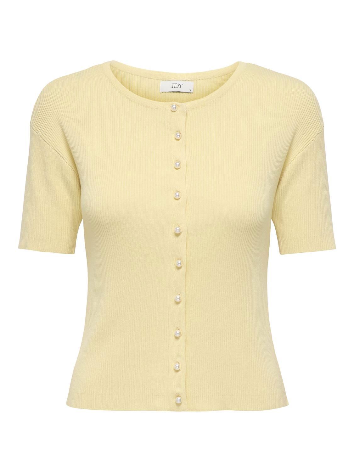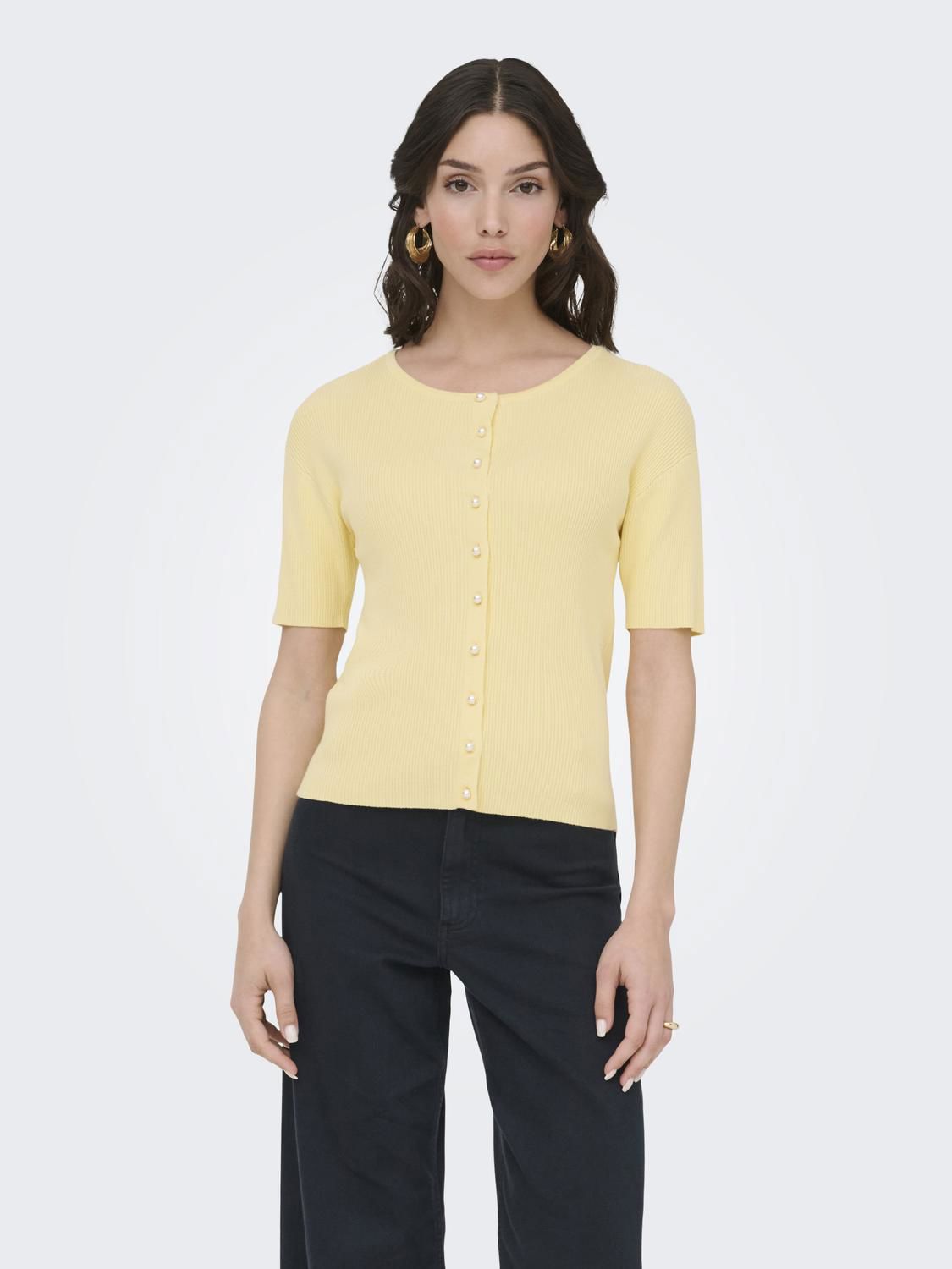 Lett strikkejakke med korte ermer og perleknapper.