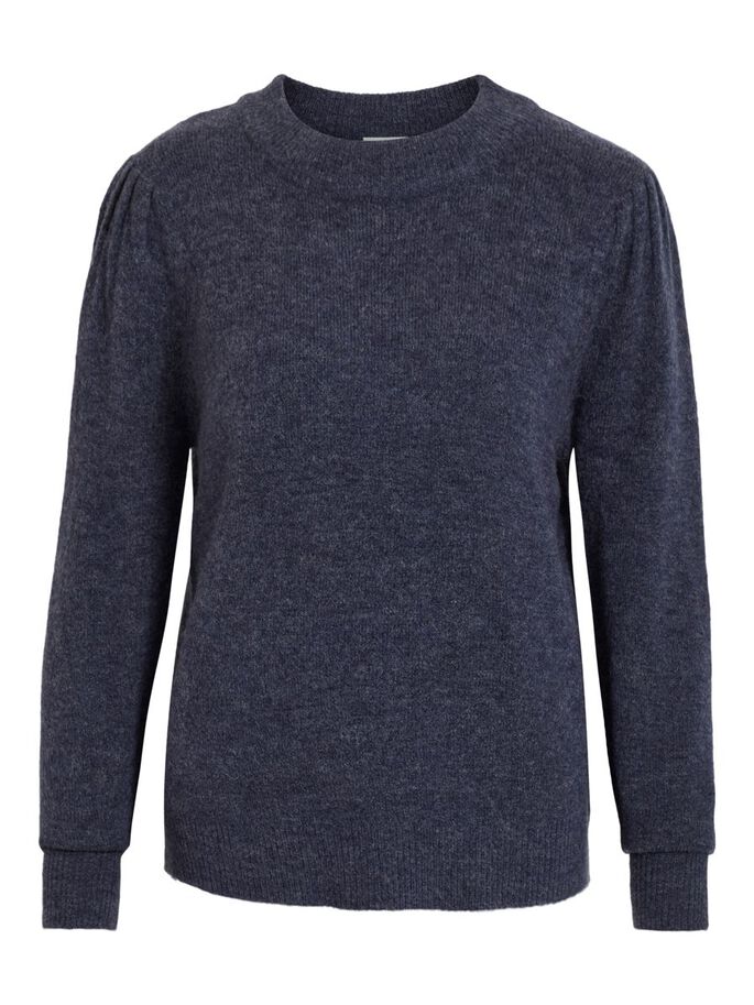 Blå melert strikkegenser med puffermer og rund hals. Veldig fin genser til god pris.