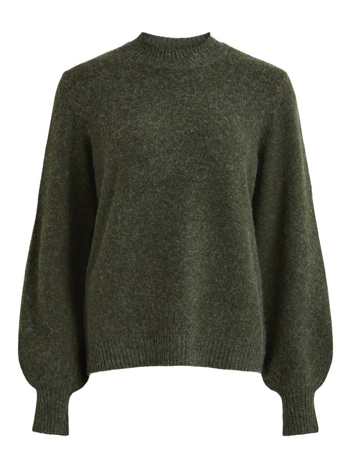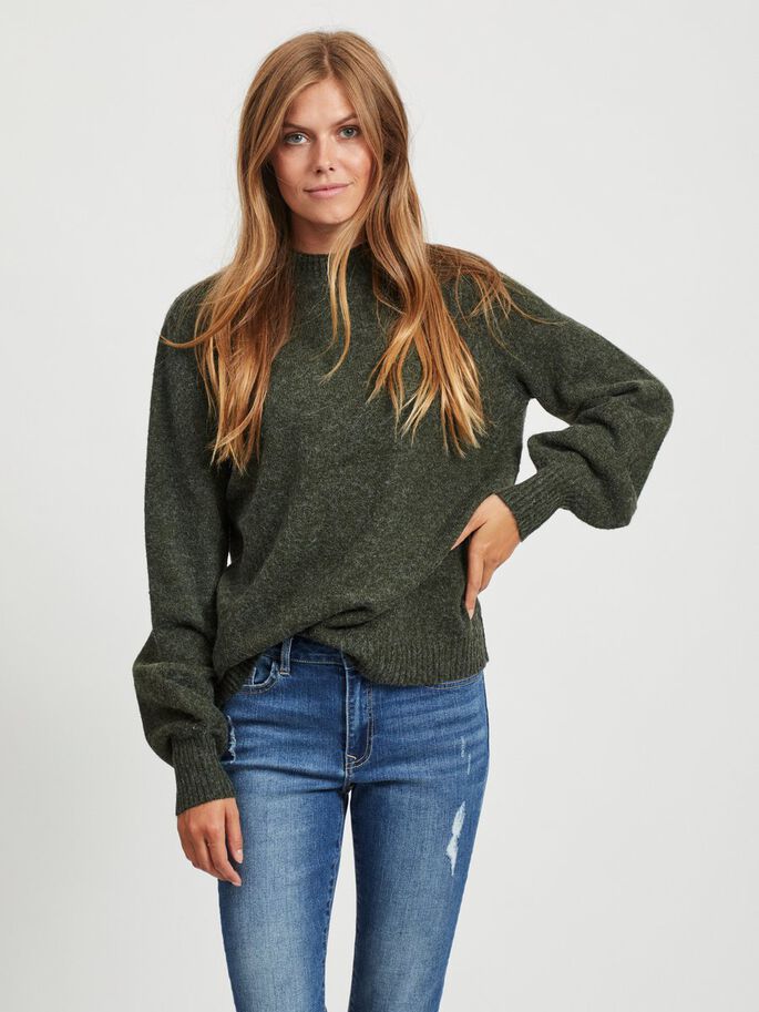 Grønn strikkegenser med halvhøy hals og ballongermer.