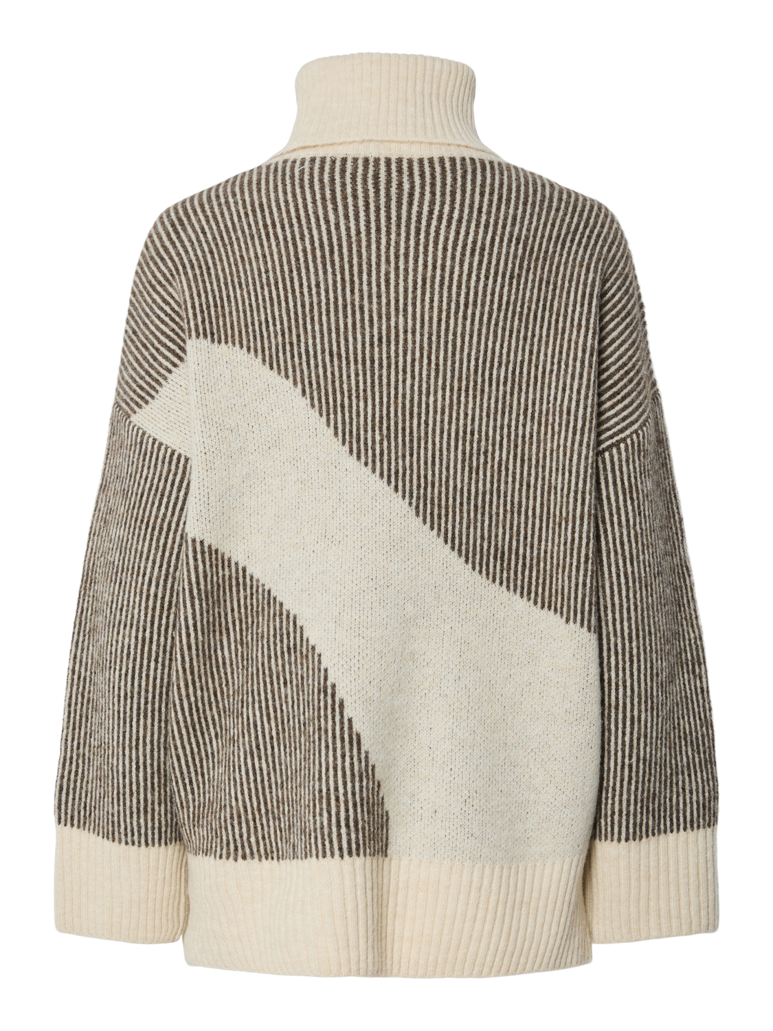 Off white og brun strikkegenser, høy hals og fint mønster.