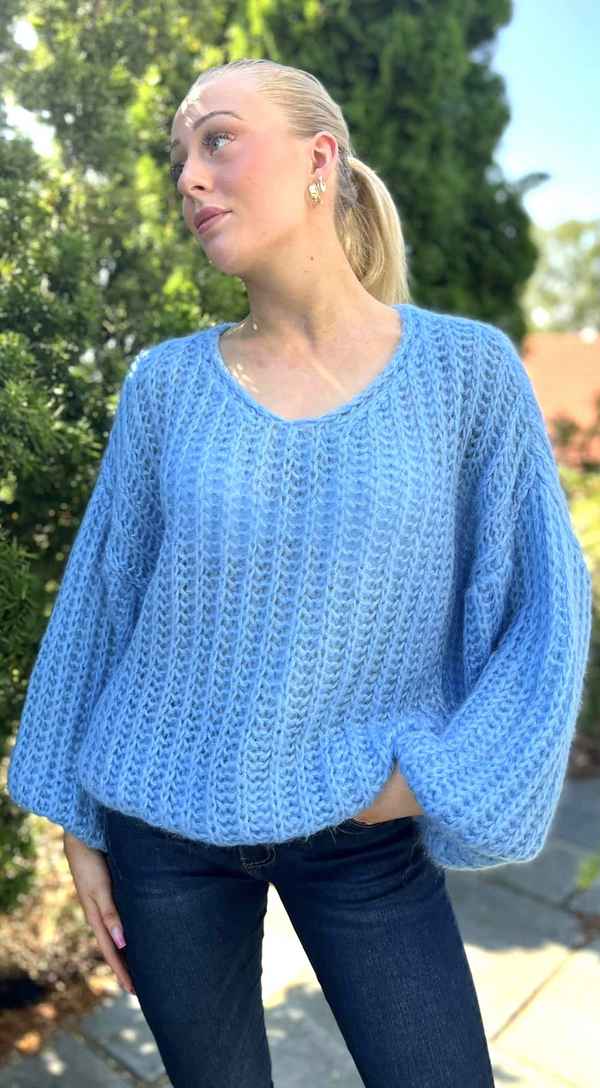 Blå strikkegenser i fin ullmix. V-hals og i èn størrelse.