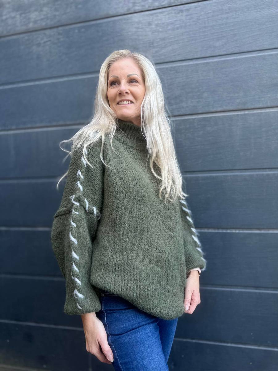 Wave genser grønn, genser med håndsydde stikninger.